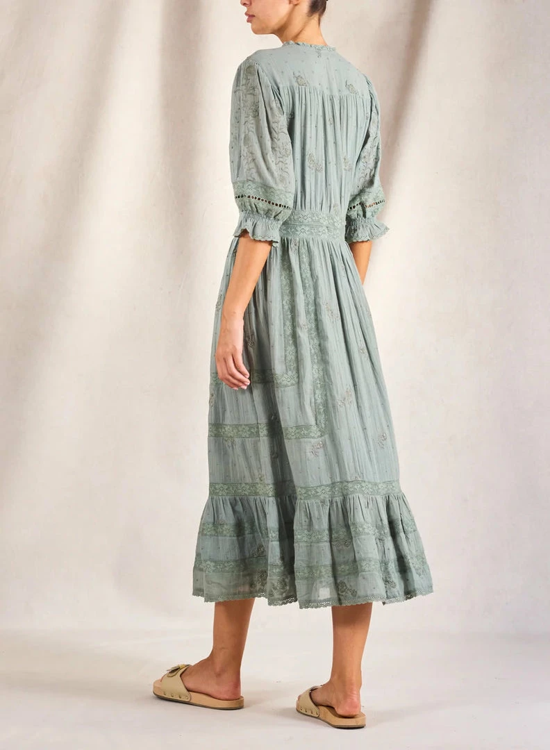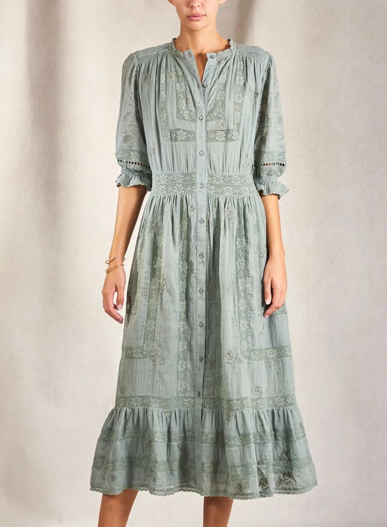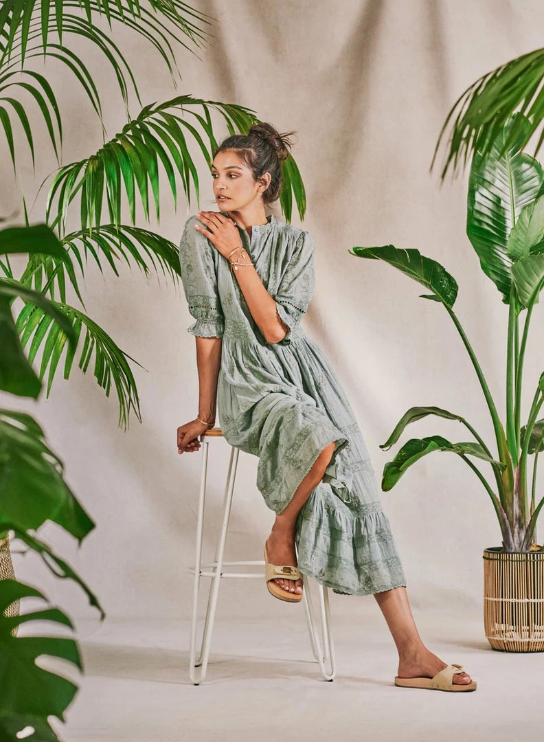 M.A.B.E green ‘Teagan’ midi dress featuring a round neckline, three quarter length sleeves with elasticated gathered cuffs, front button fastenings, an embroidered laced design and a frilled hem. Model is wearing a size XS.
