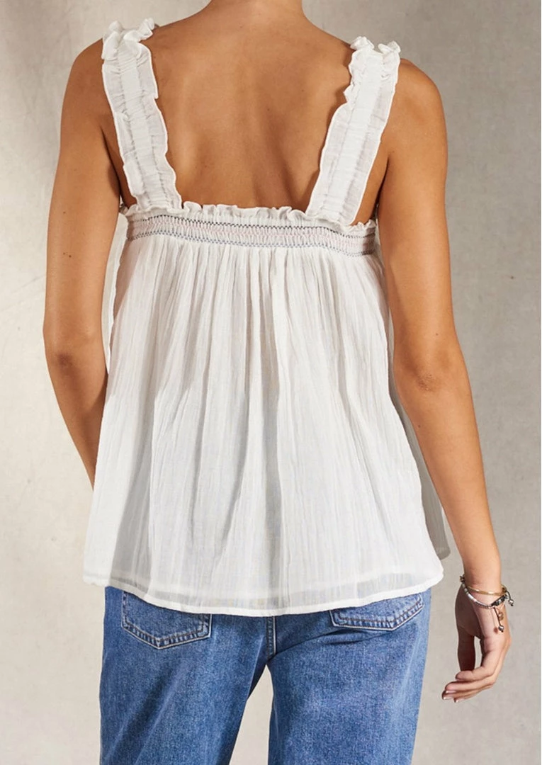 M.A.B.E off white ‘Romy Frill’ top featuring a square neckline with coloured embroidered details, thick elasticated straps with frill trimming and a pull on style. Item fits true to size. Model is wearing a size XS