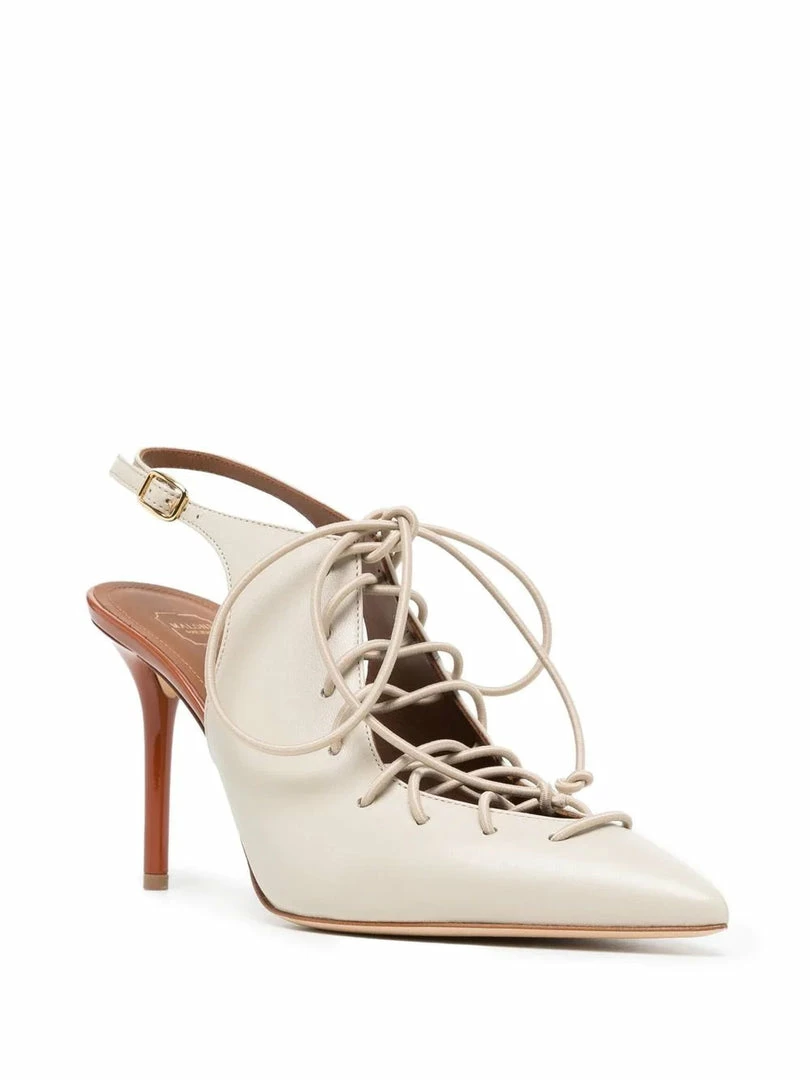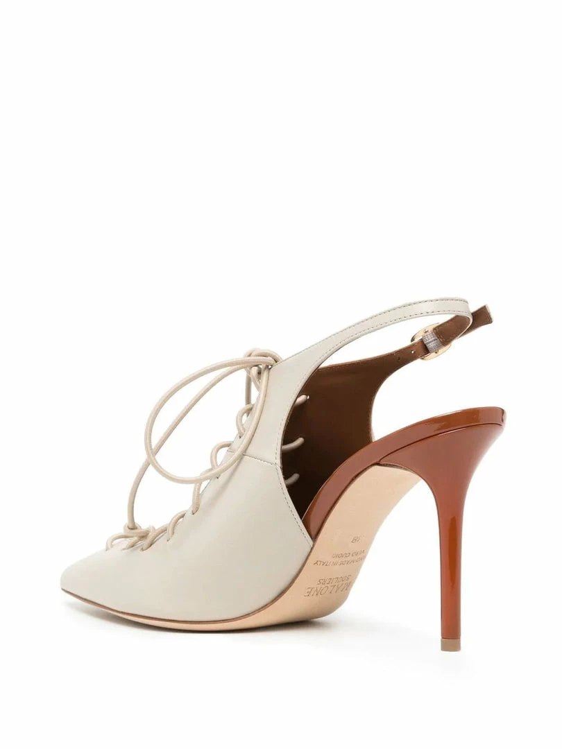 Malone Souliers light grey ‘Alessandra 85-11’ mules featuring a pointed toe, a lace up fastening with a buckled ankle strap, a branded insole, a contrasting patent brown stiletto heel and an open front design. Made in Italy. Item fits true to size. Italian Sizing.