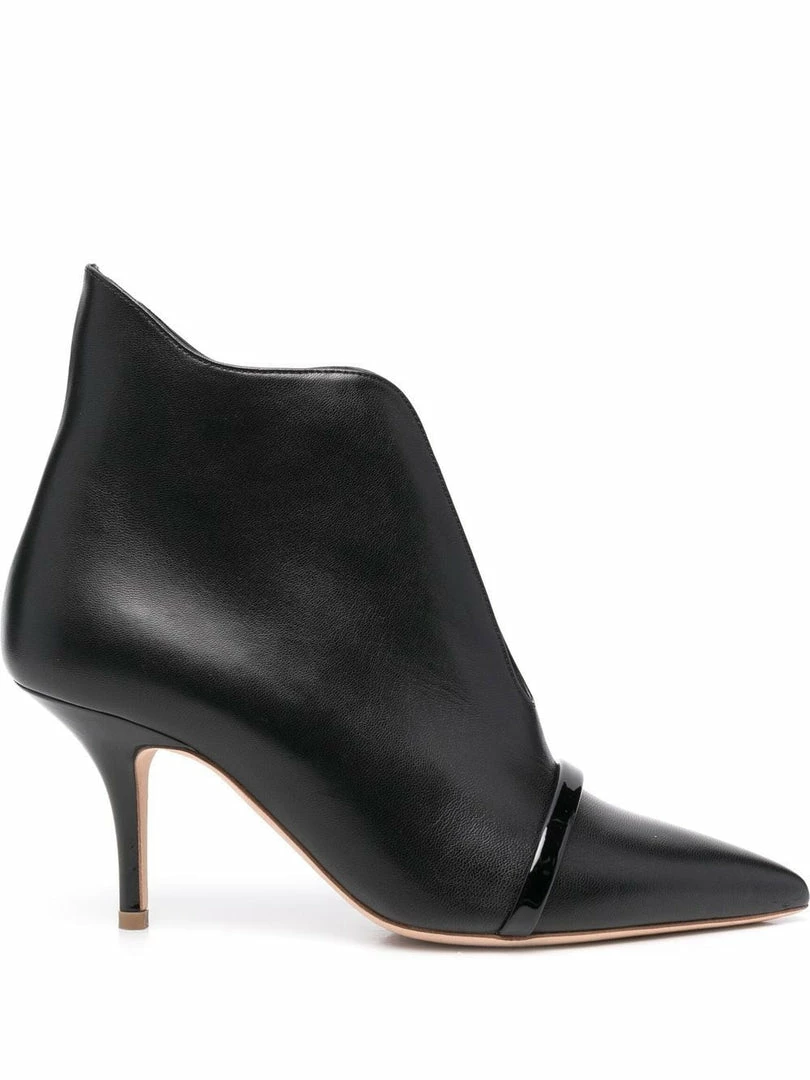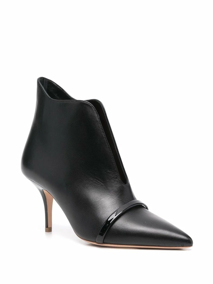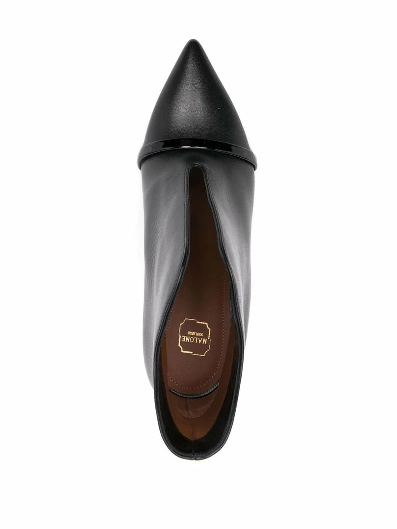 Malone Souliers black ‘Cora’ boots featuring a pointed toe with a front slit detail, a contrasting strap design, a branded insole, a kitten stiletto heel and a slip-on style. Made in Italy. European Sizing. Item fits true to size.