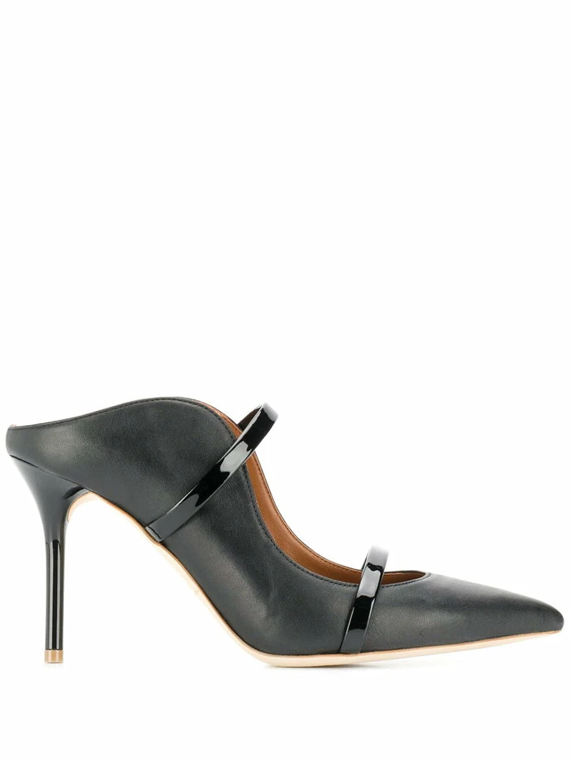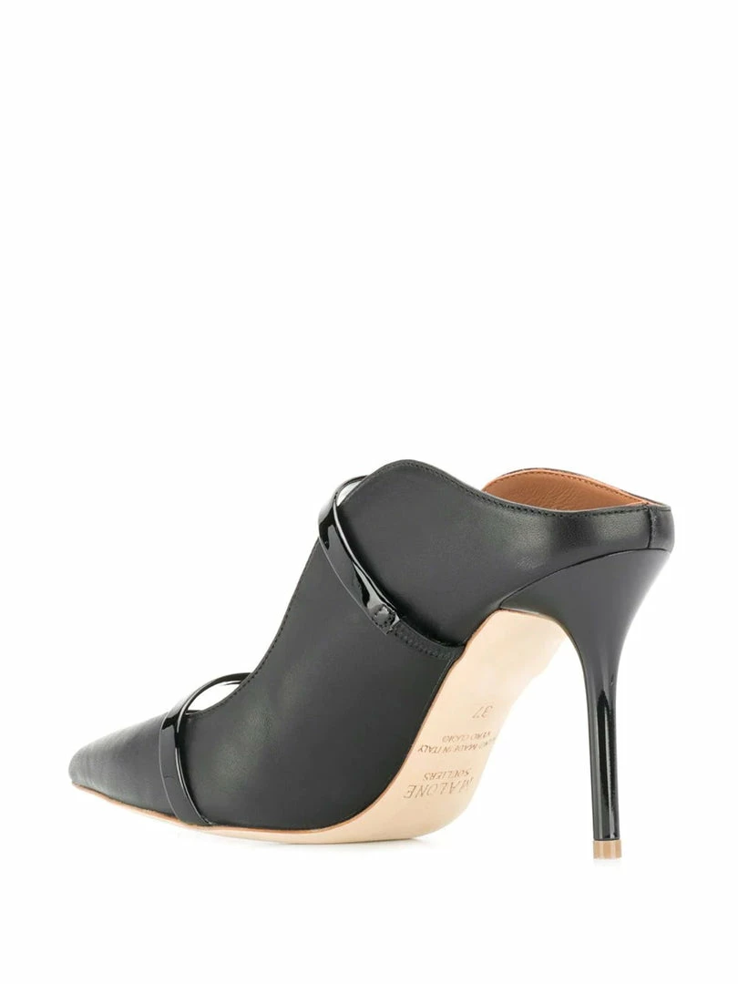Malone Souliers black ‘Maureen MS 85-23’ mules featuring a pointed toe, a double strap design, a branded insole, a stiletto heel and a slip-on style. Made in Italy. European Sizing. Item fits true to size.