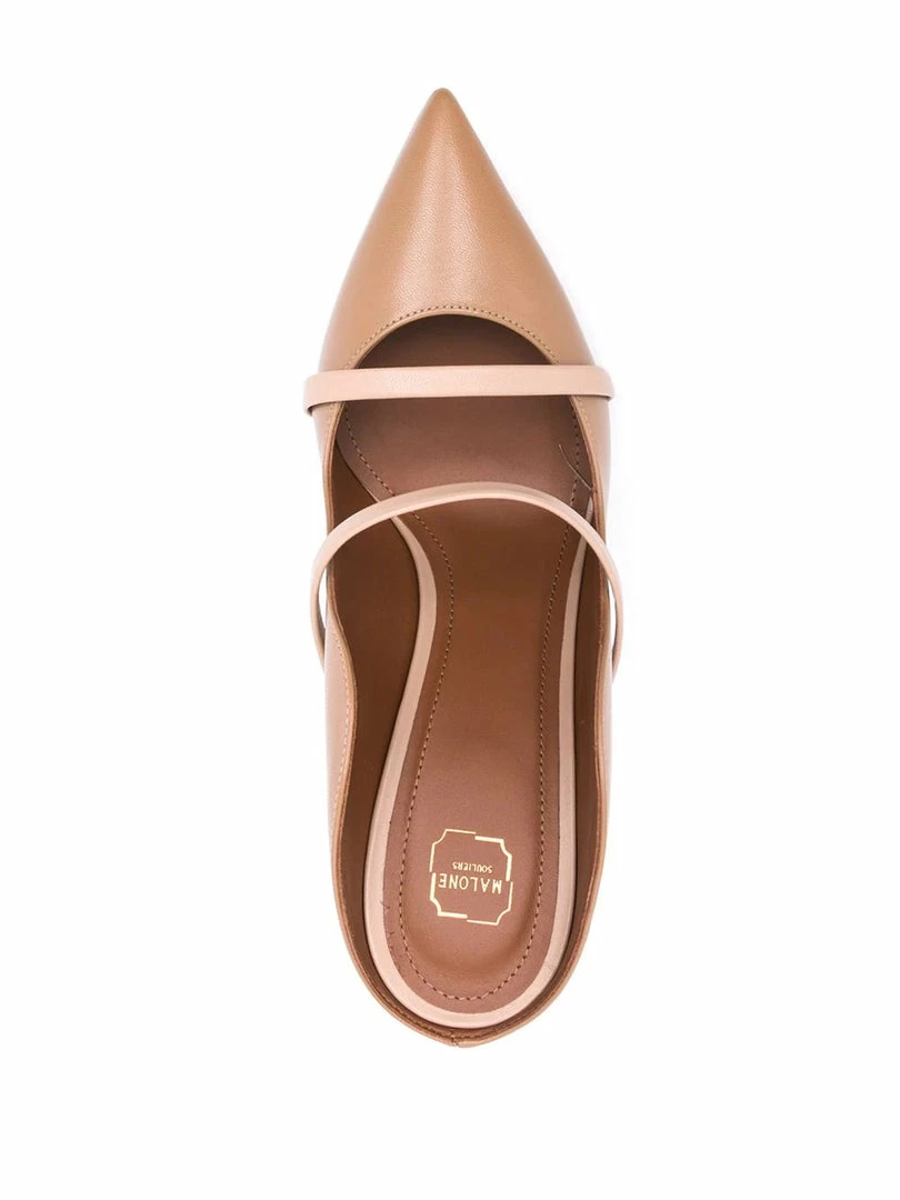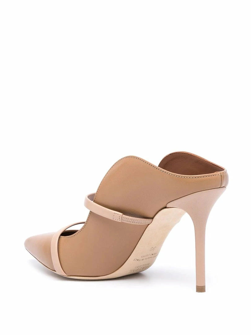 Malone Souliers beige ‘Maureen 85’ stiletto mules featuring a pointed toe, two contrasting leather top straps, signature curved sides, an open back and a stiletto heel. Item fits true to size. Italian Sizing. Made in Italy.