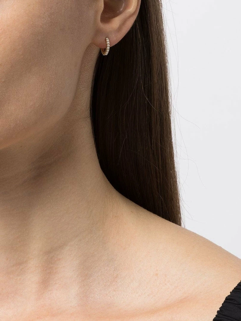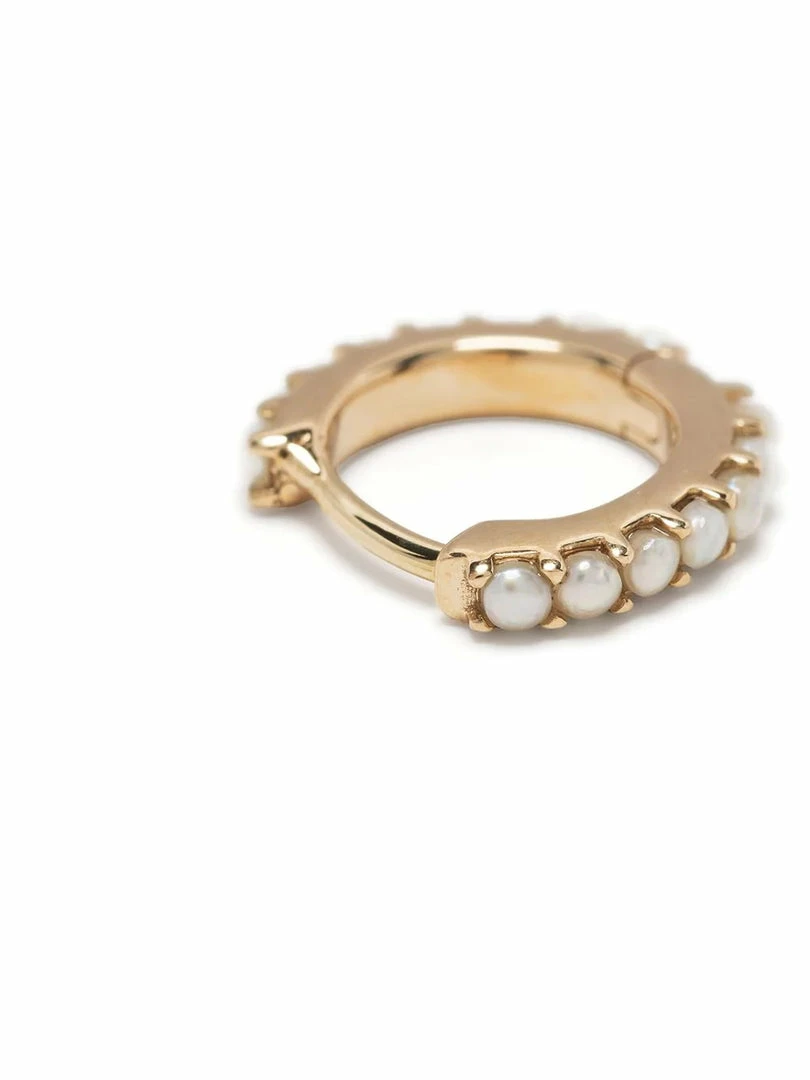 Maria Black gold ‘Mignon Huggie’ earring featuring a hoop design, 15 x 1.5mm freshwater pearls and a clip fastening. Sold as a single earring.Â