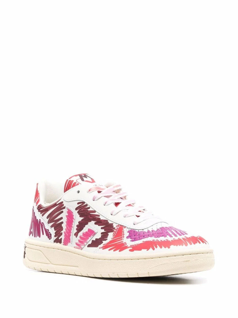 ‘Veja x Marni V-10 Trainers’ featuring a round toe, a front white and pink lace up fastening, a signature ‘v’ design on the sides, a red and pink scribbled design and a branded tongue and insole. Made in Brazil. Item fits true to size. European Sizing.