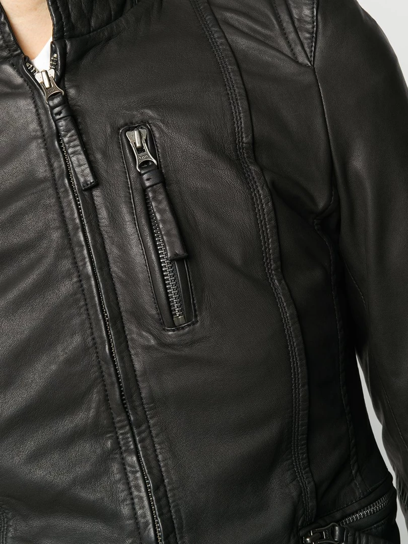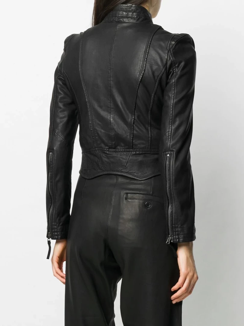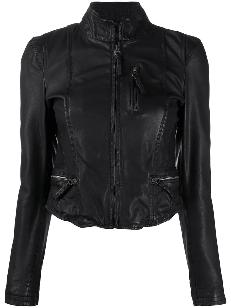 Munderingskompagniet black ‘Rucy’ zipped leather jacket featuring a high neckline, a front zip fastening, long sleeves with zipped cuffs, three front zipped pockets and a fitted style. Item fits true to size. Model is wearing a size 38 FR.Â