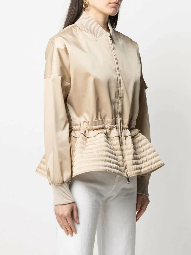 Moncler beige ‘Baldah’ peplum jacket featuring a ribbed collar and cuffs, a front zip fastening, a pocket and logo patch detail on the left arm, long sleeves, a drawstring around waistline, concealed side zip pockets and a quilted hemline. Item fits true to size. Model is wearing a size 1.