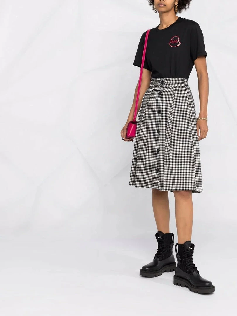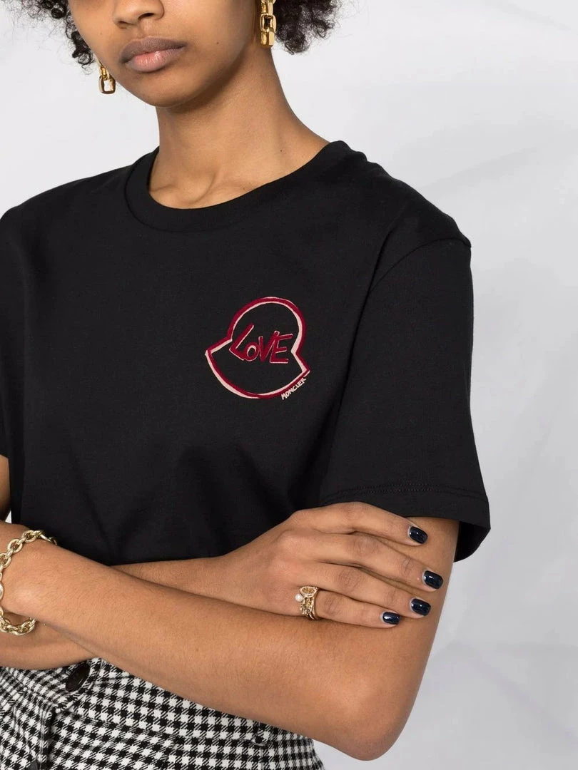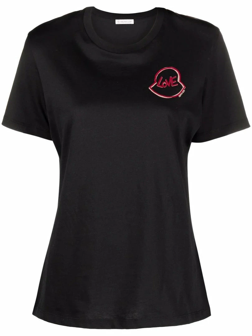 Moncler black ‘Love Logo Patch T-shirt’ featuring a round neck, short sleeves a red ‘Love’ logo patch on the front and pulls on. Item fits true to size. Model is wearing a size S.Â