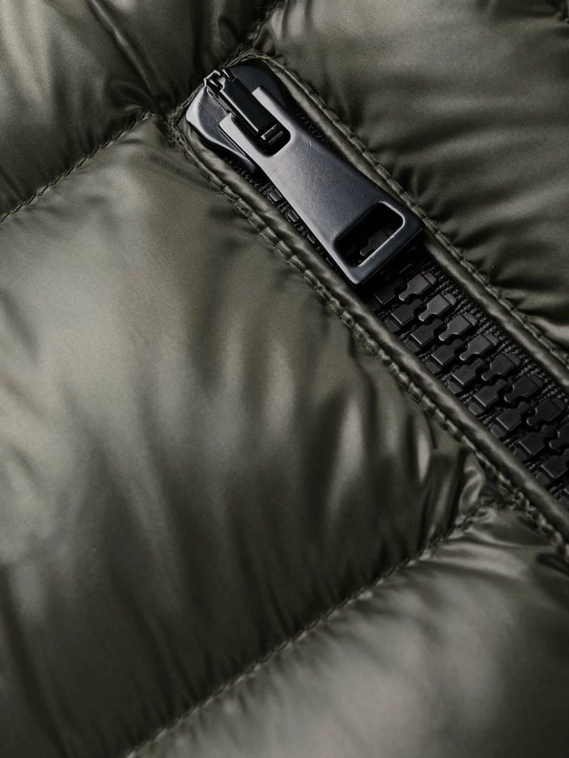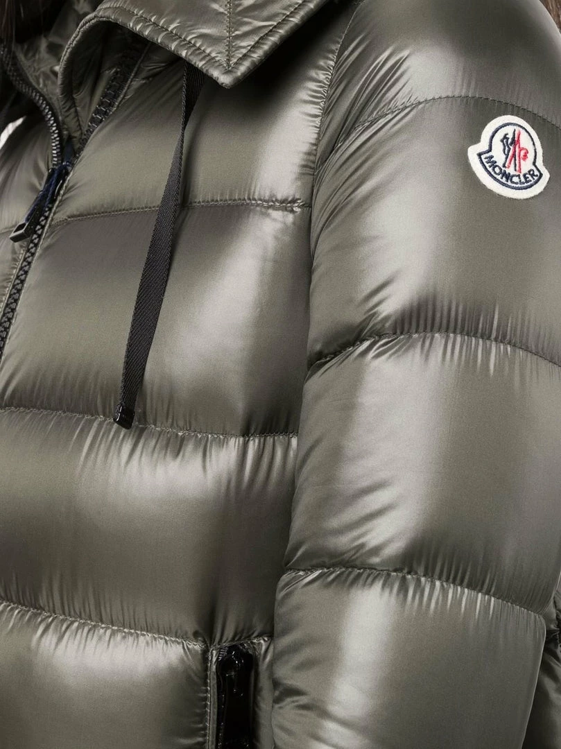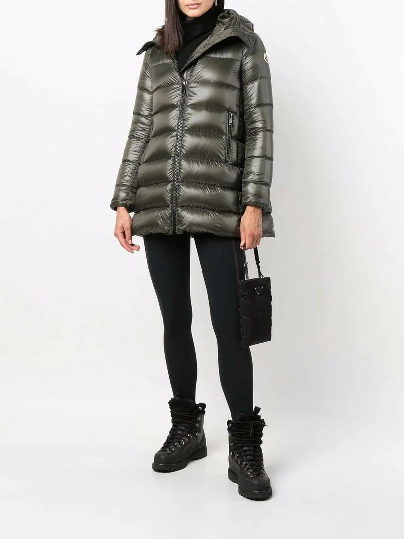 Moncler khaki ‘Suyen’ coat featuring a classic hood, a front zip fastening, long sleeves with a logo patch on the left arm, elasticated cuffs, two front zip pockets, a midi length and a padded design. Item fits true to size. Model is wearing a size 0.