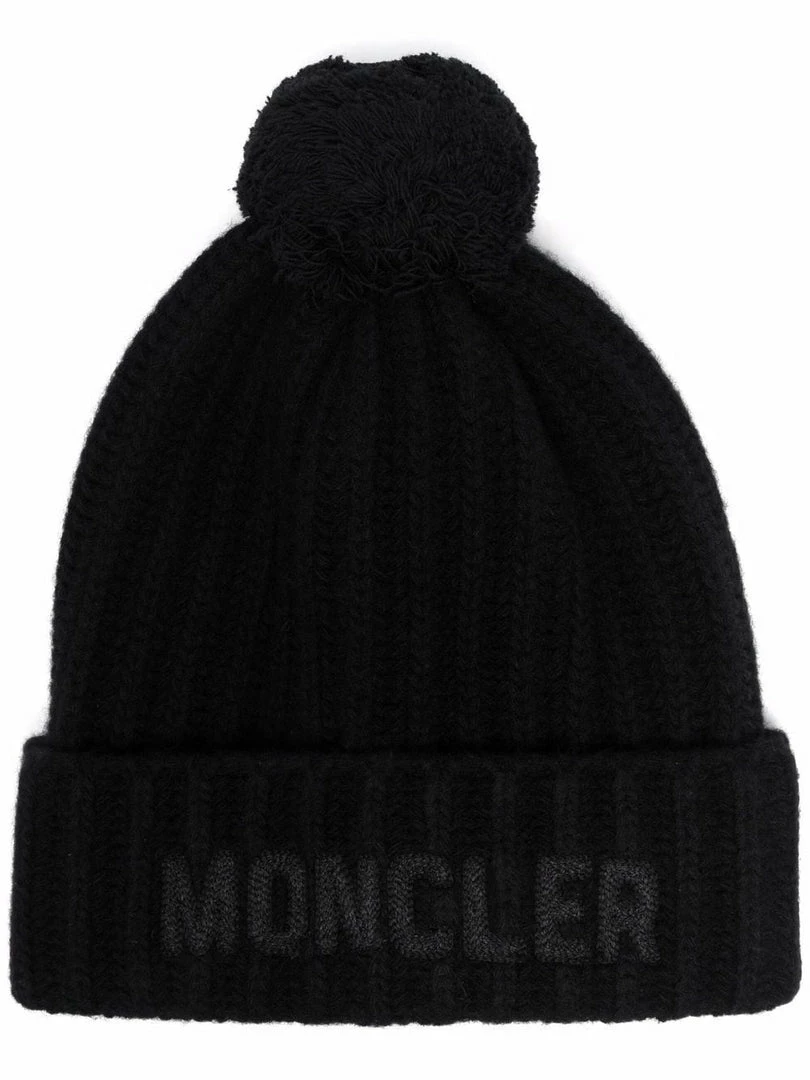 Moncler black ‘Logo Detail Pom Pom Hat’ featuring a knitted design, a rolled up hem with a front logo detail and pulls on. One Size. Made in Italy.