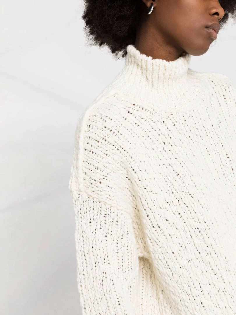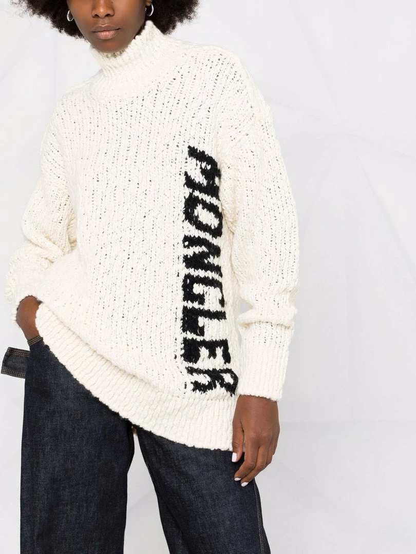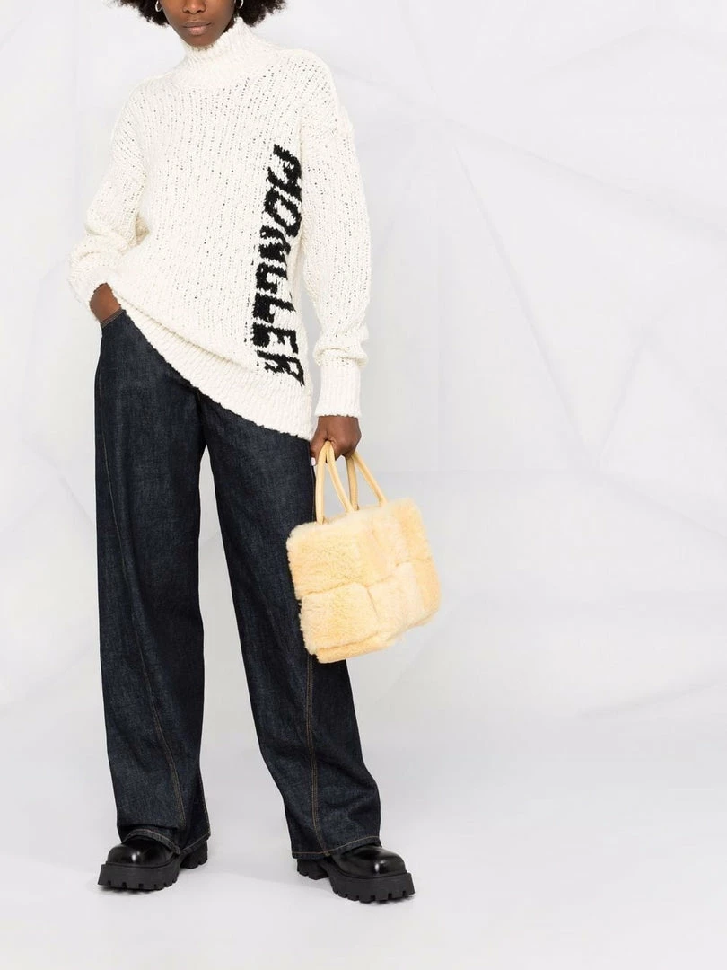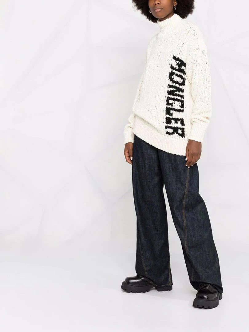 Moncler off white ‘Logo-Intarsia Knitted Jumper’ featuring a high neck, dropped shoulders, a black logo knit detail to the side, long sleeves, a straight hem and pulls on. Item is slightly oversized. Model is wearing a size S.Â