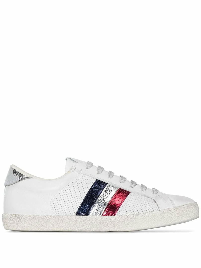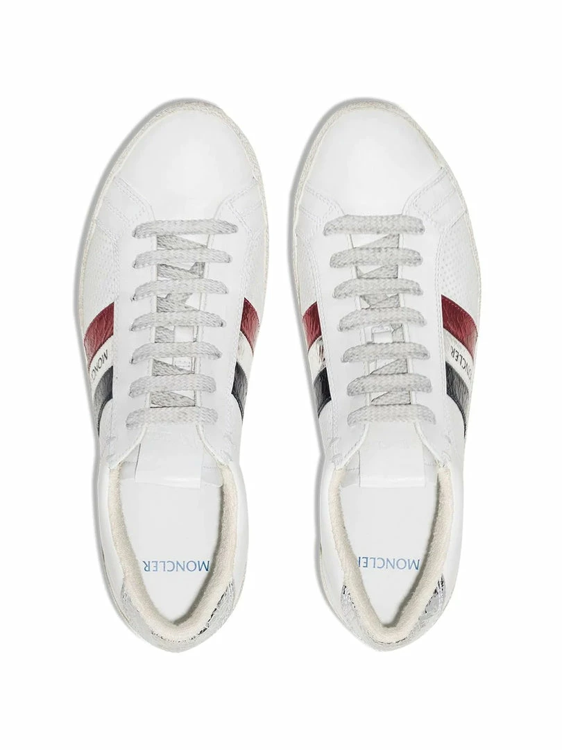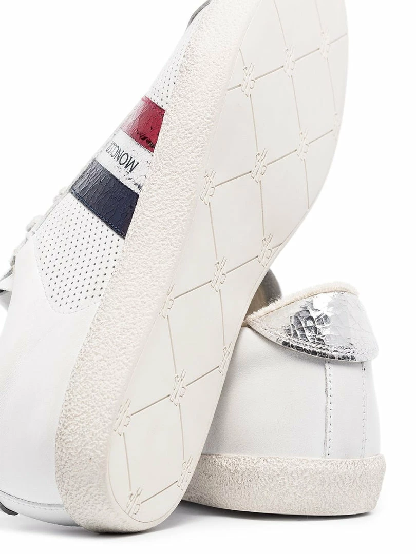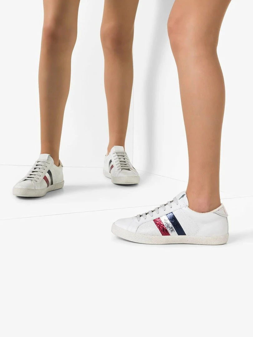 Moncler white ‘Ryegrass’ leather sneakers featuring a round toe, a lace up fastening, a distressed dirty finish, a striped logo pattern detail to the side, a silver creased effect heel counter, a branded insole, perforated side panels and a flat rubber sole. Made in Italy. Italian Sizing. Item fits true to size.