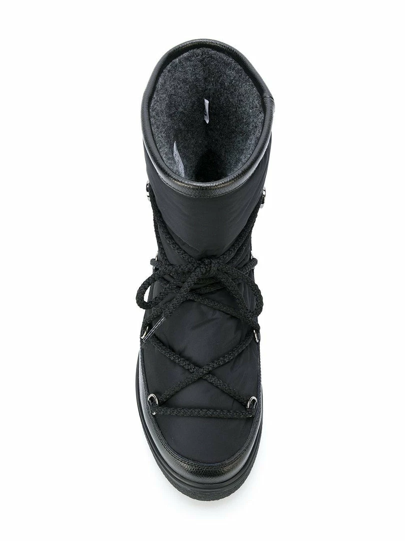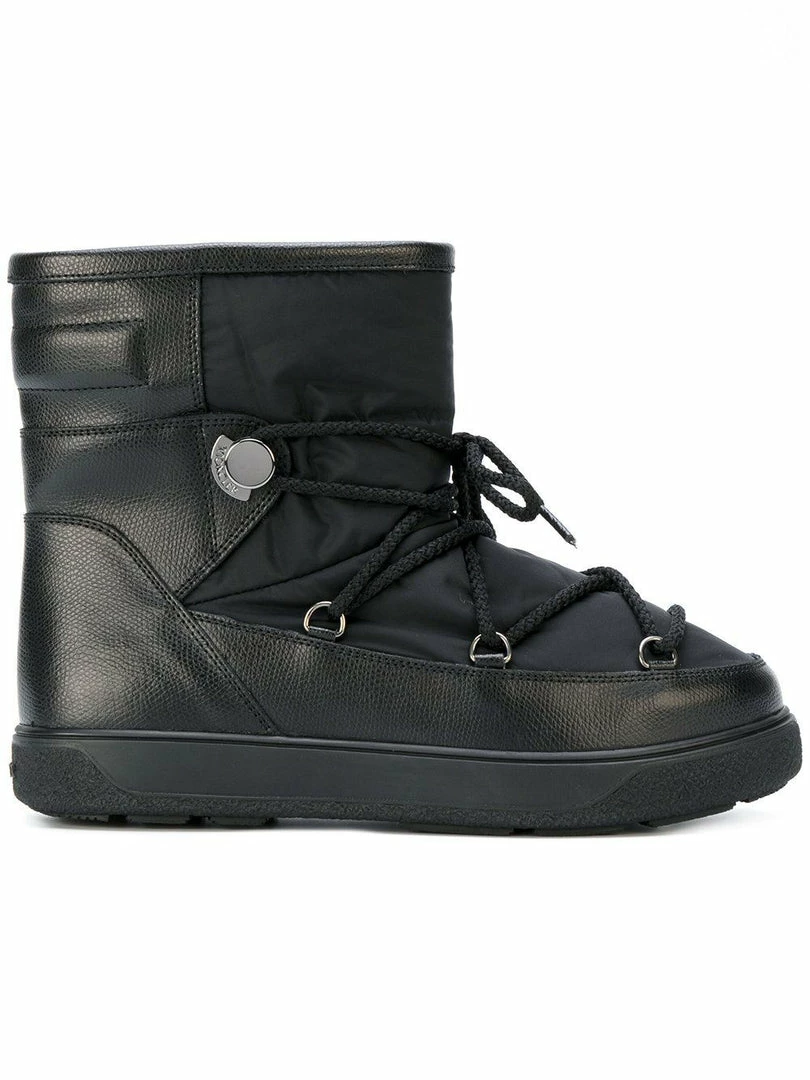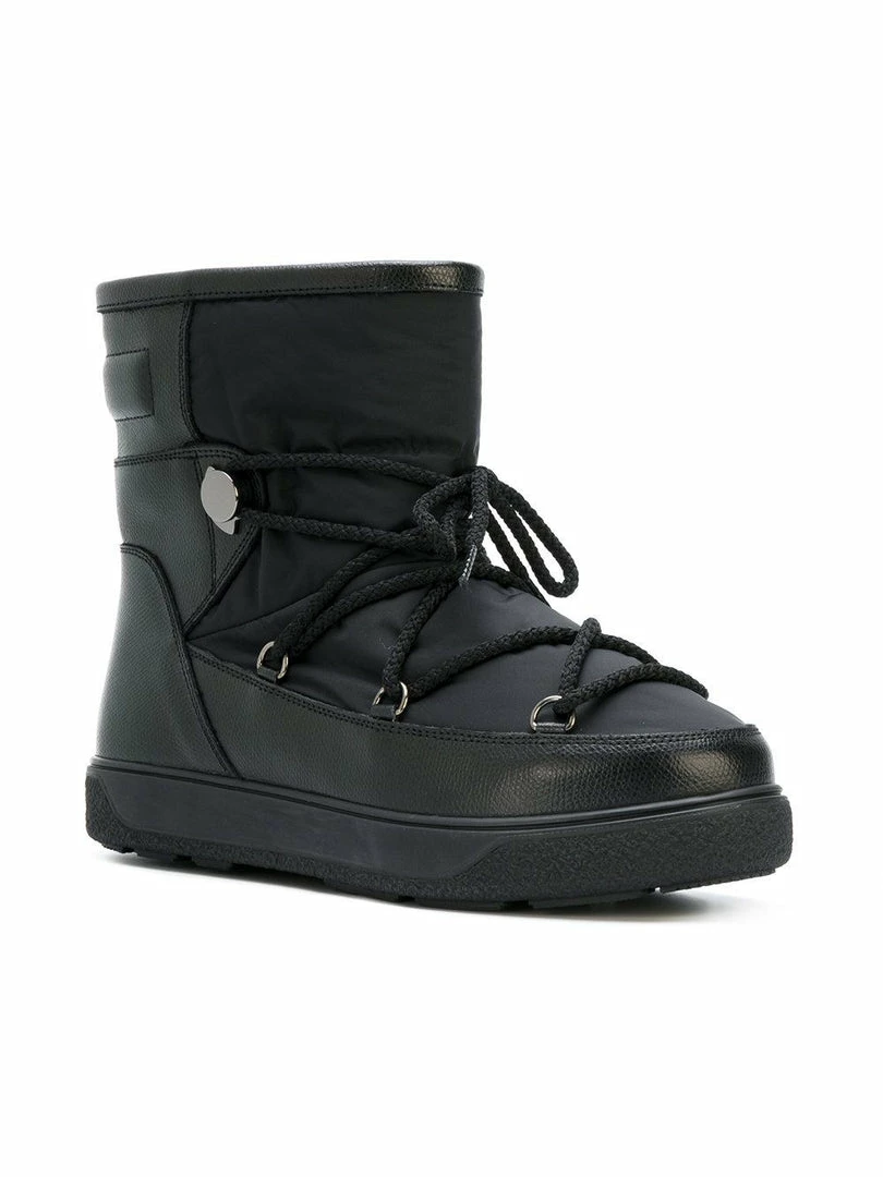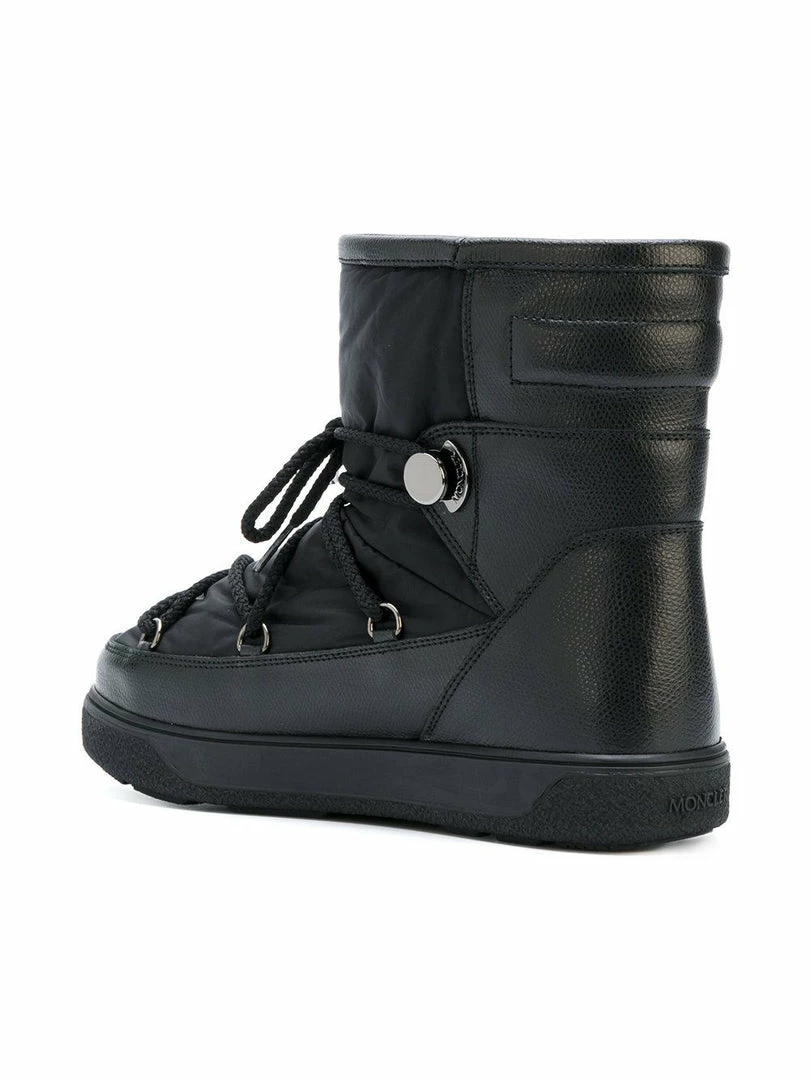 Moncler black leather and padded ‘Stephanie’ boots featuring a round toe, lace-up padded front, leather front trim and back detail, rubber sole with a wool lining. Made in Italy.