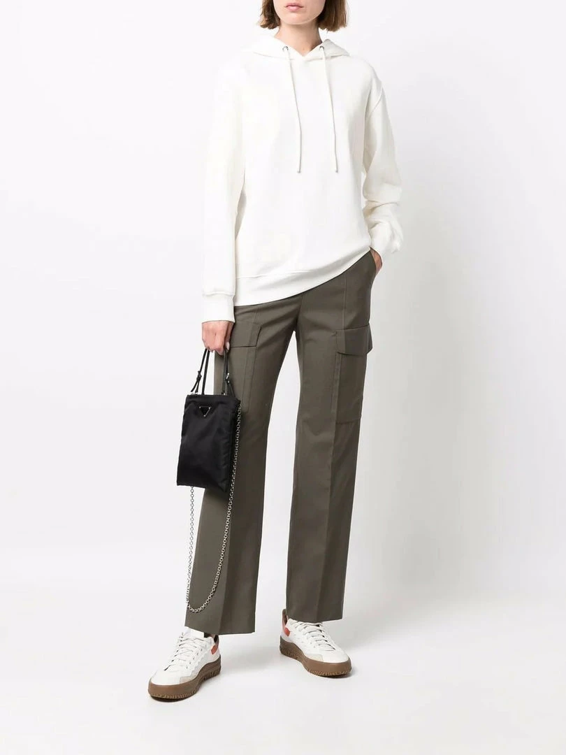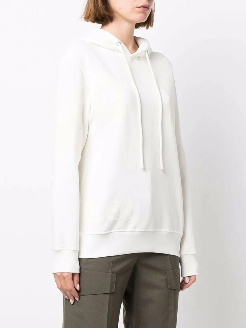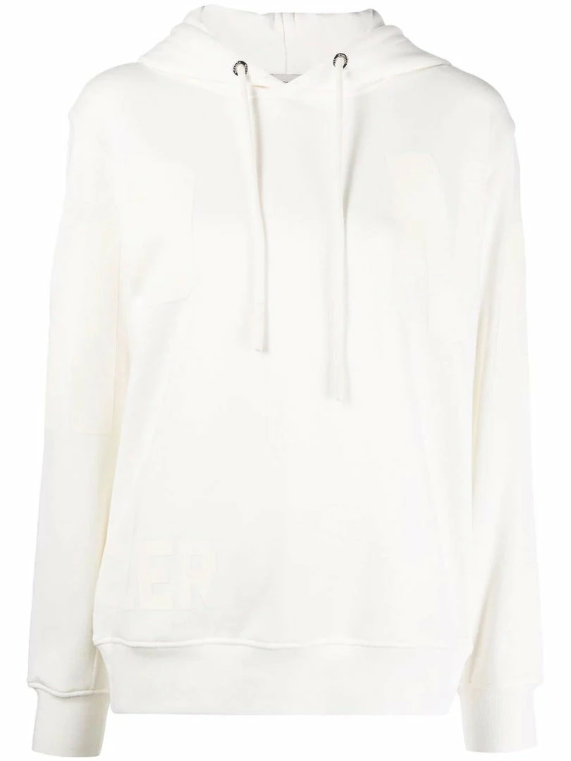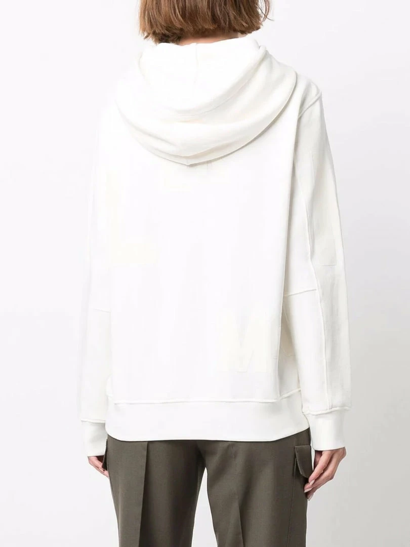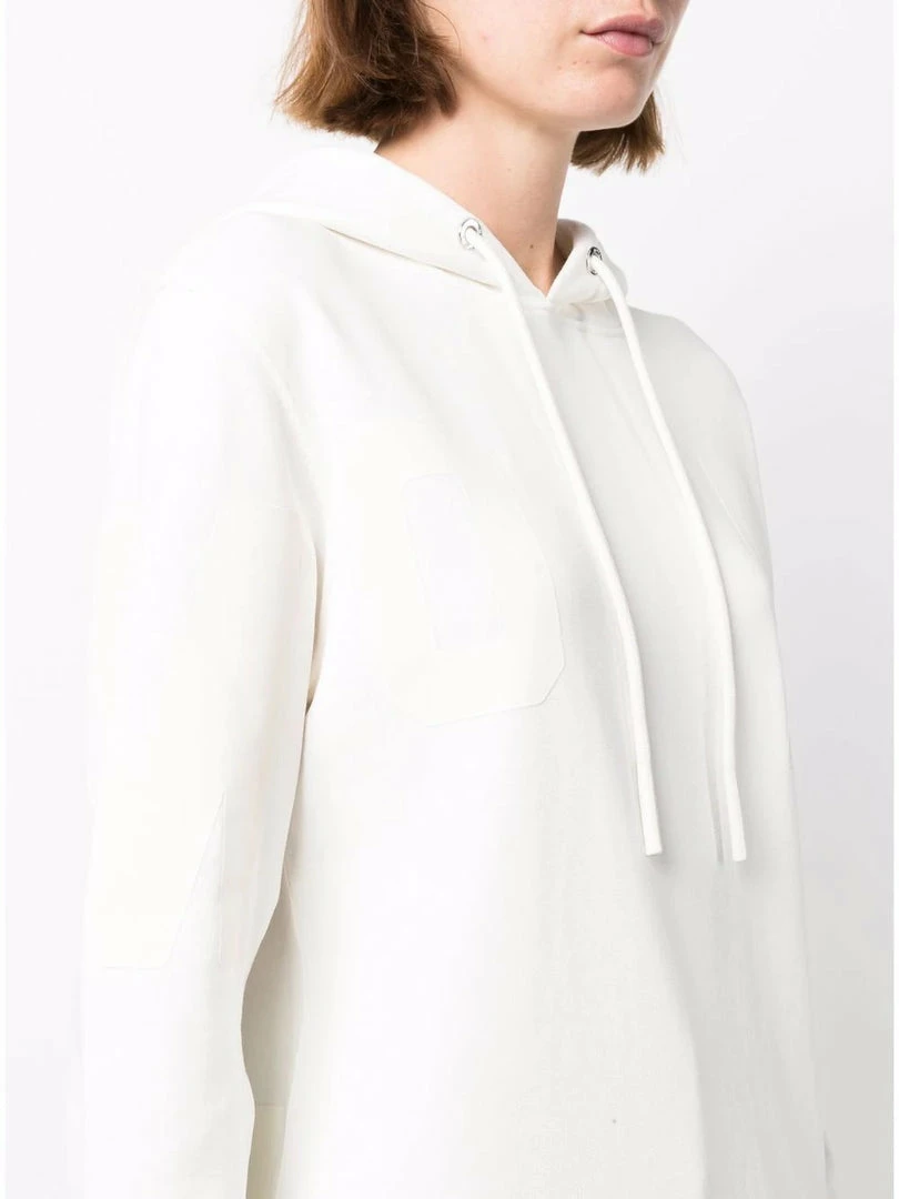 Moncler ‘White Logo Detail Hoodie’ featuring a drawstring hood, long sleeves, logo detailing, ribbed hems and pulls on. Item fits true to size. Model is wearing a size S.
