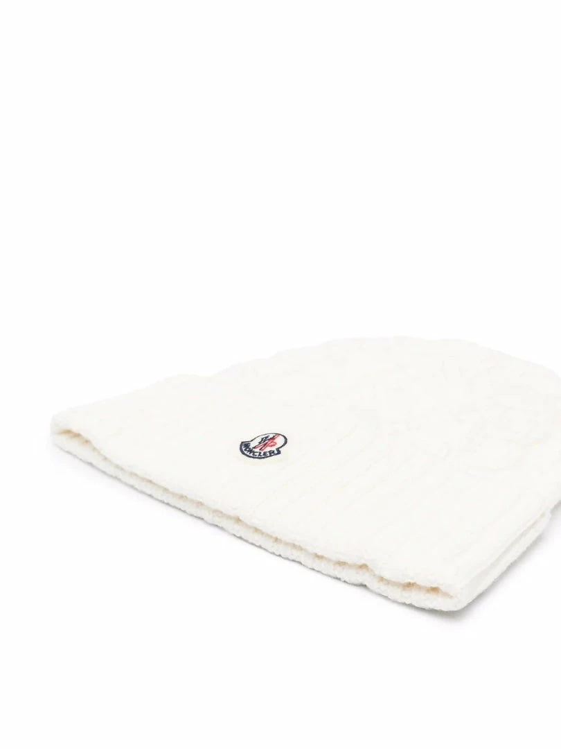 Moncler white ‘Logo-Patch Knitted Beanie’ featuring a rolled up hem, a front logo patch, a cable knit design and pulls on. One Size.
