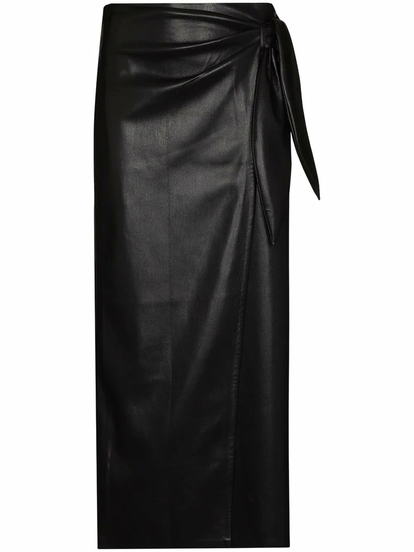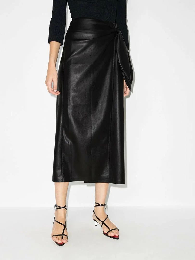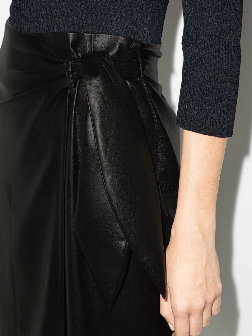 Nanushka black ‘Amas’ vegan leather midi skirt featuring a wrap around style with a front tie fastening, an elasticated back, a high waist fit and a back pocket detail. Item fits true to size. Model is wearing a size S.