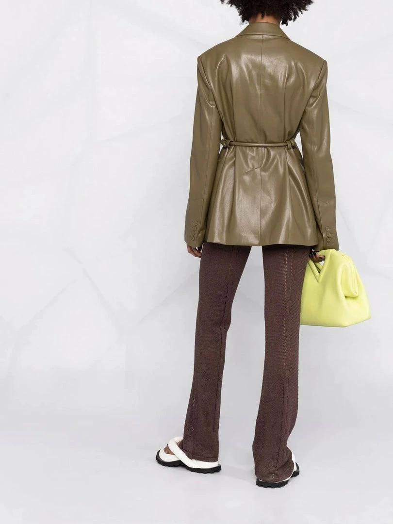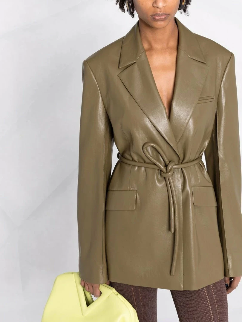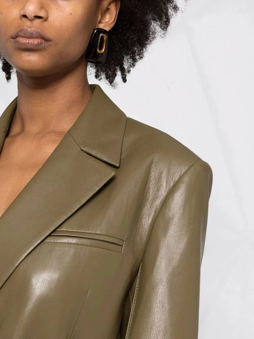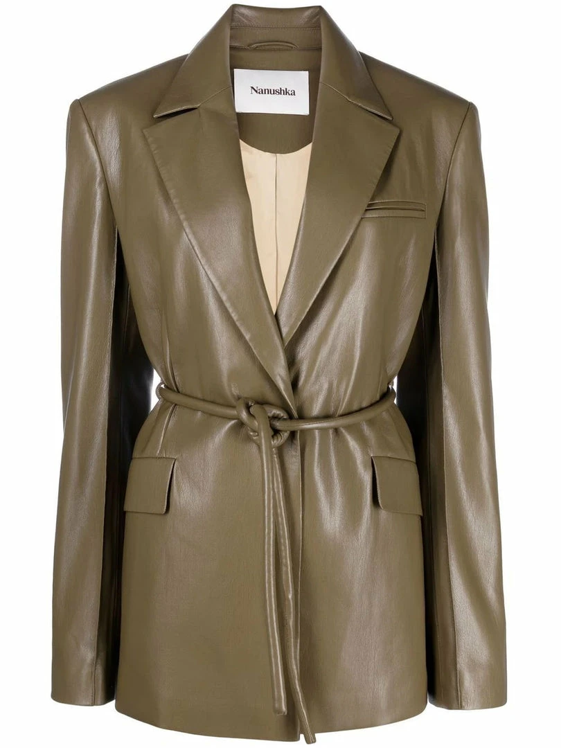 Nanushka olive green ‘Mariko’ vegan leather blazer featuring lapels, front button fastenings, a belted tie waist, belt loops, long sleeves with buttoned cuffs, a front three pocket design and a back slit. Item fits true to size. Model is wearing a size S.Â