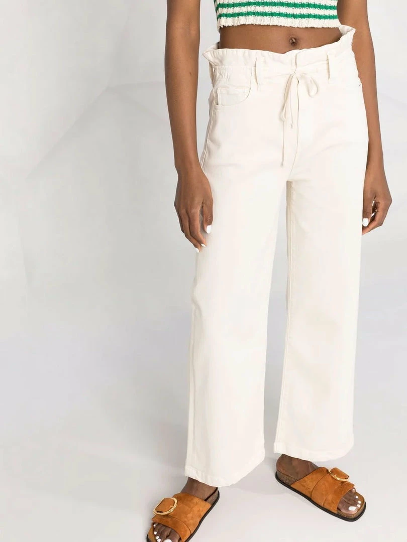 Paige ecru ‘Carly’ wide leg jeans featuring a drawstring waistband tie detail, belt loops, a front zip fastening, a five pocket design, a wide leg fit and a high rise style. Item fits true to size. Model is wearing a size 27 W.