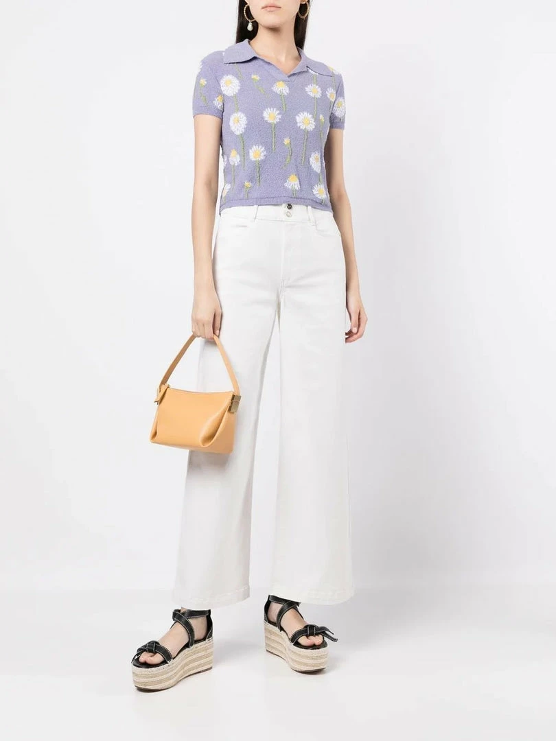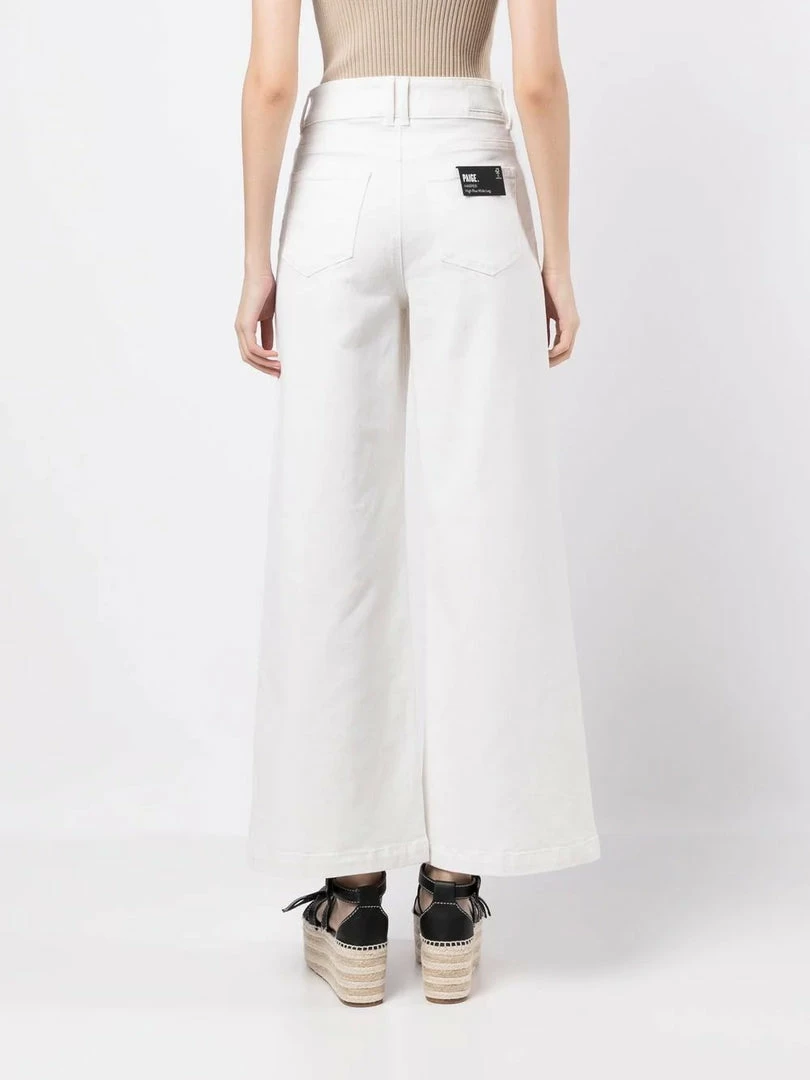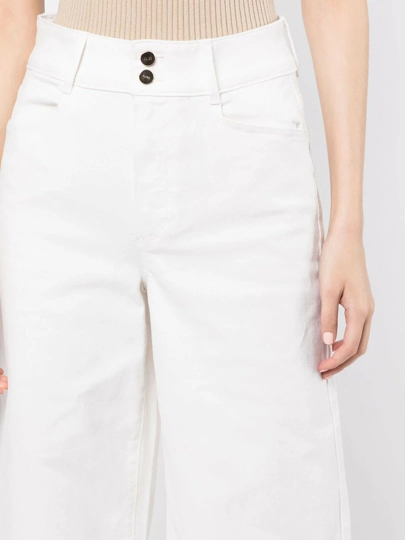 Paige ecru ‘Harper’ 30″ wide leg jeans featuring a front button and zip fastening, belt loops, a four pocket design and a branded patch at the back. Item fits true to size. Model is wearing a size 27 W.
