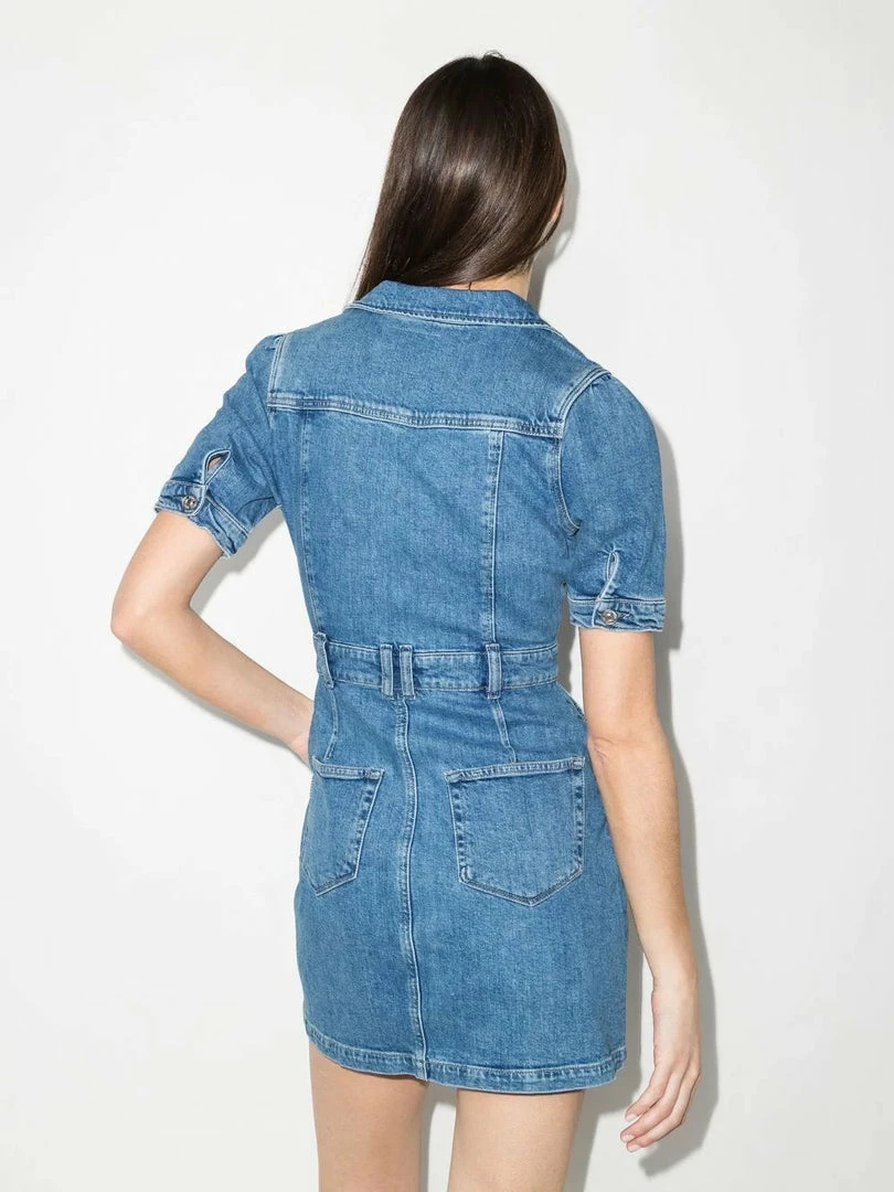 Paige blue ‘Mayslie’ denim mini dress featuring a collared neckline, front button fastenings, short sleeves with buttoned cuffs, belt loops and a six pocket design. Item fits true to size. Model is wearing a size S.