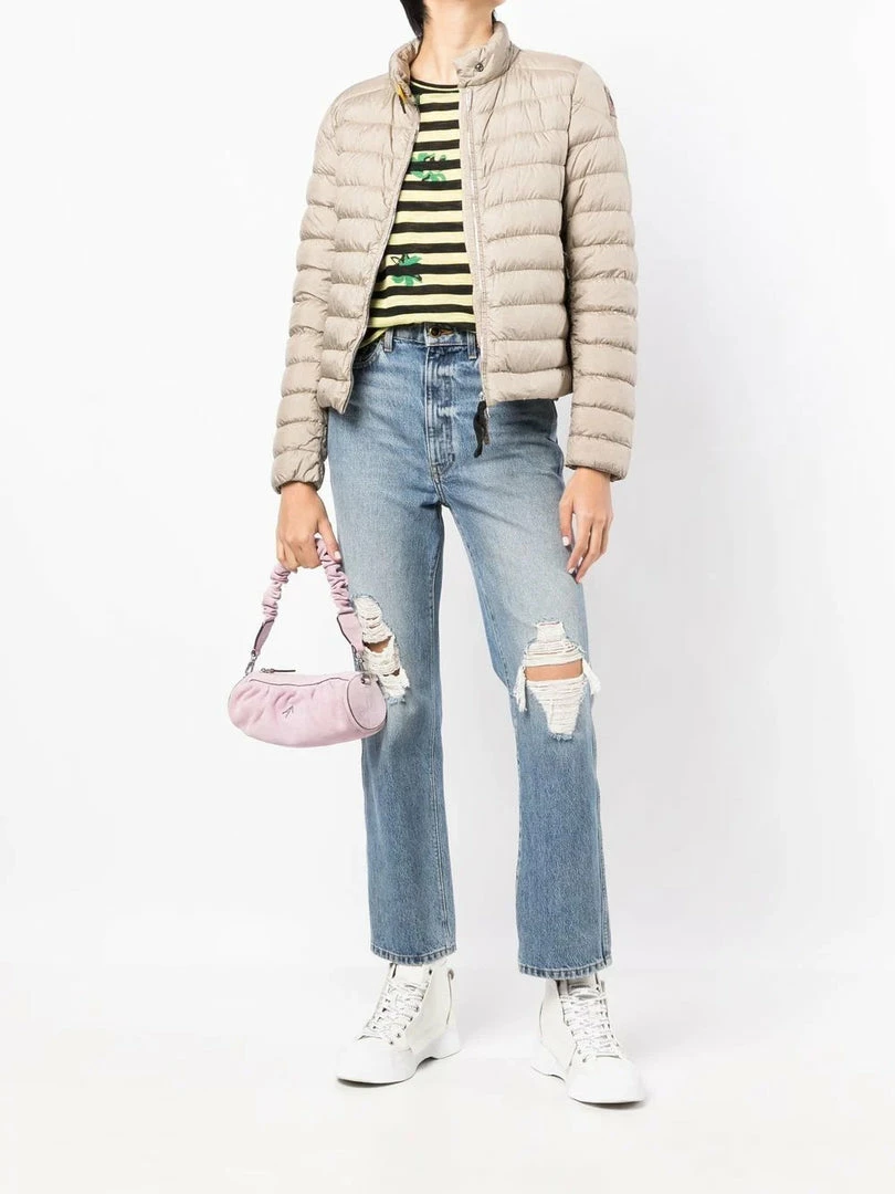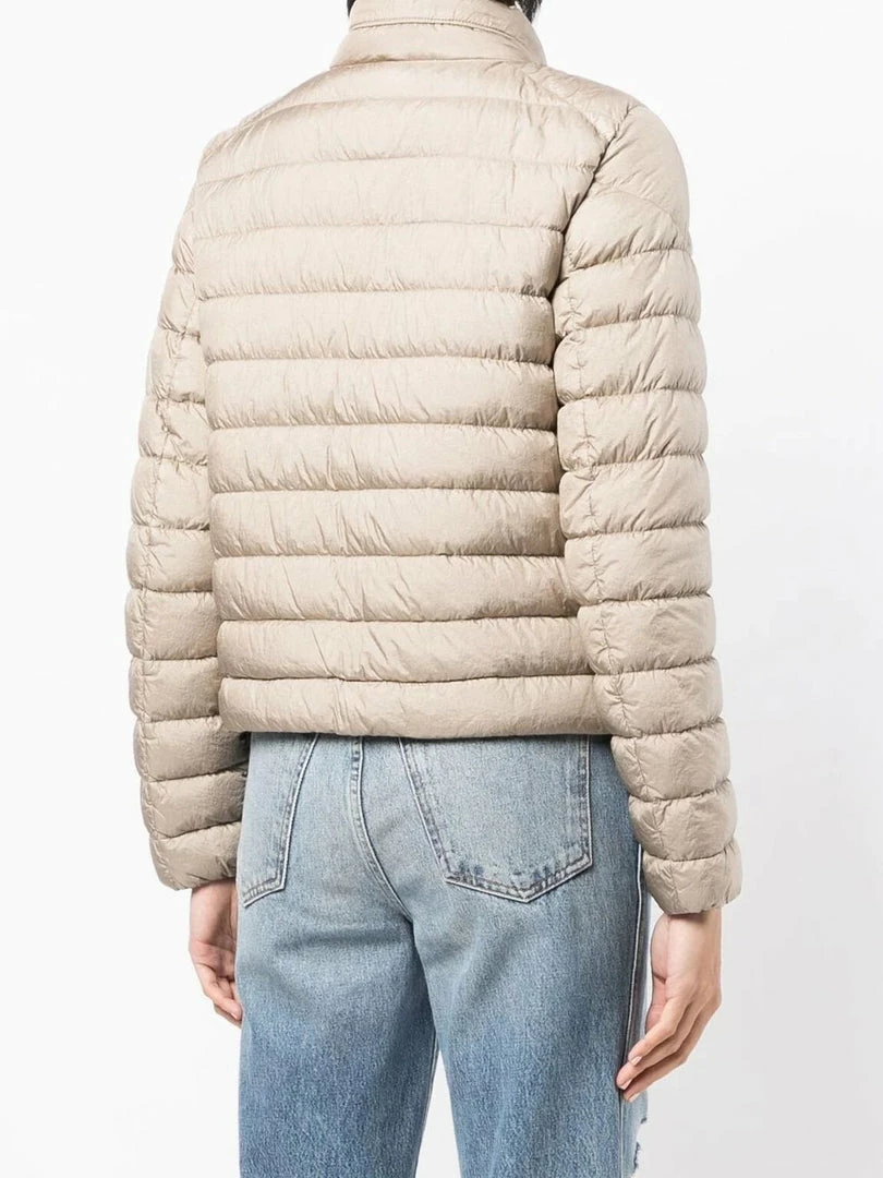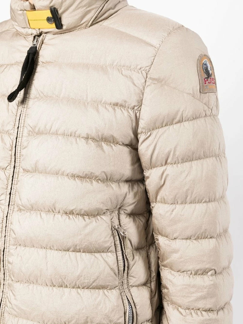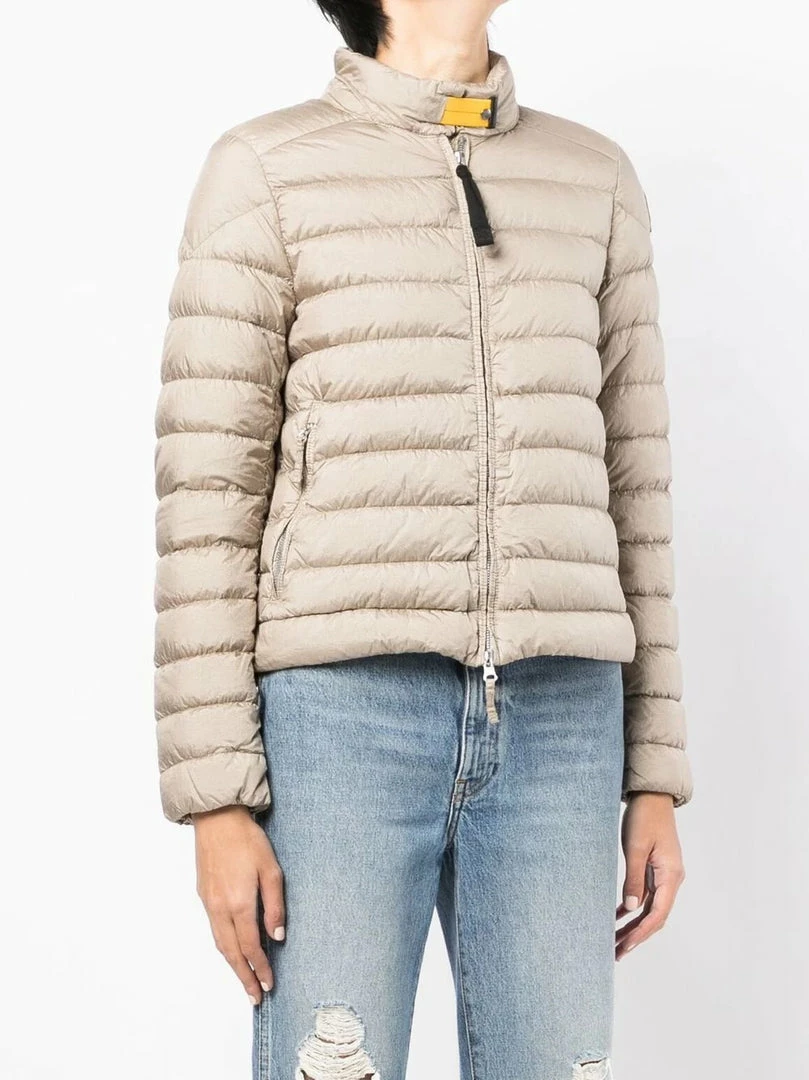 Parajumpers light beige ‘Sybil’ jacket featuring a raised neck, a front button and zip fastening, long sleeves, a logo patch on the left arm, front zip pockets and a padded design. Item fits true to size. Model is wearing a size S. Â