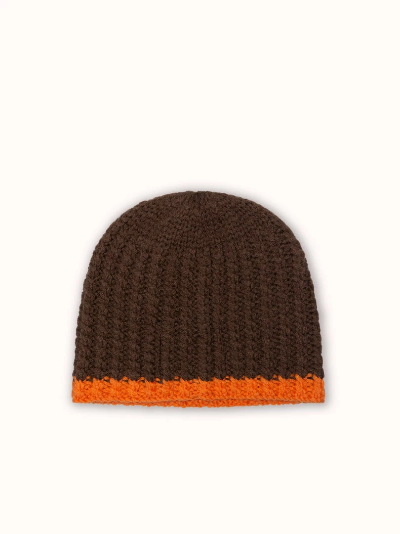 Resume brown ‘Hand Knitted Beanie’ featuring a cable knit design, a contrasting orange rim and a pull on style. Item is One Size. Made in China.