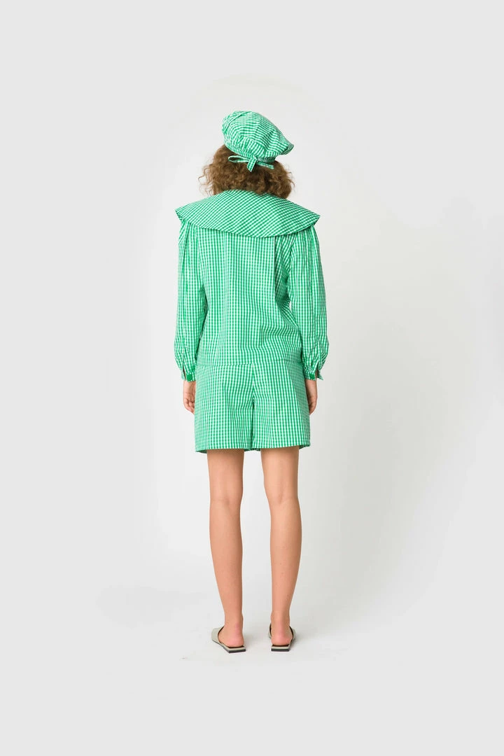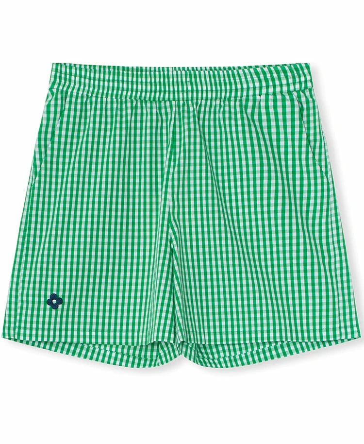 Resume green and white gingham ‘LorenzaRS’ shorts featuring a drawstring waist with an elasticated band, side slip pockets, a navy floral embroidered detail on the leg and a pull on style. Item fits true to size. Model is wearing a size 36 DE/DK.