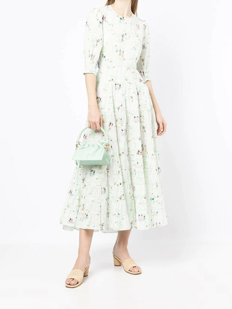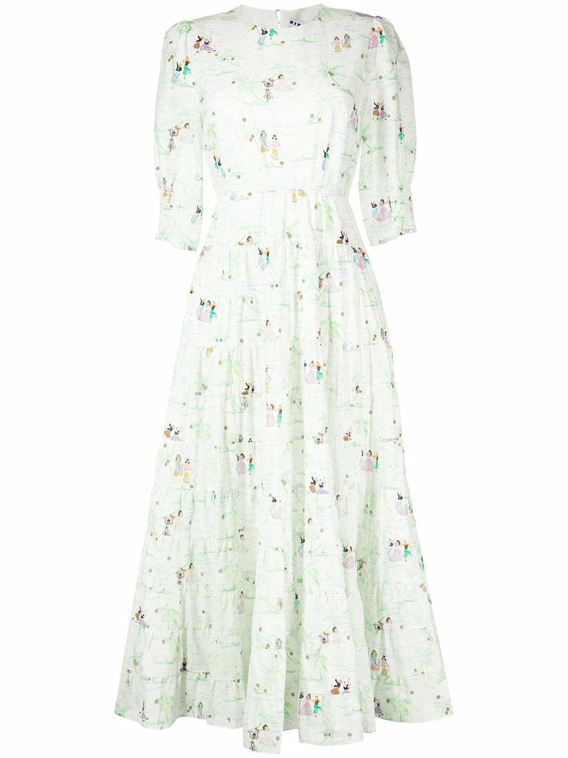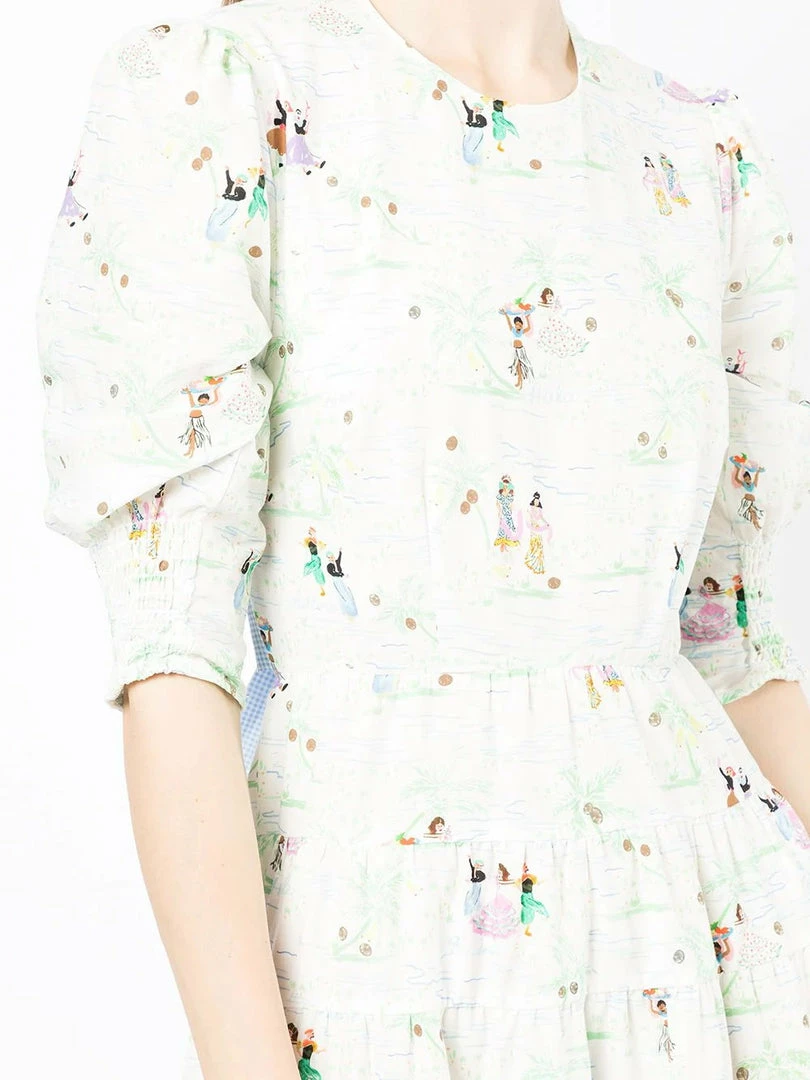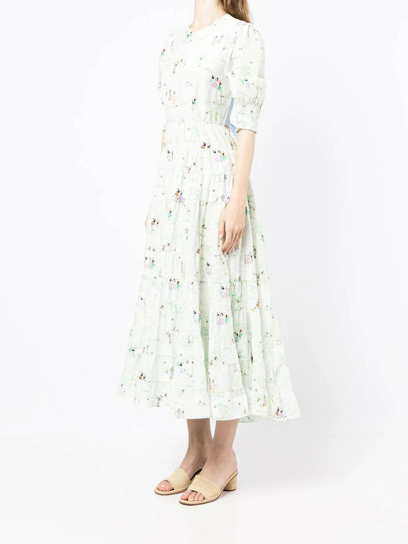 Rixo cream ‘Agyness’ illustrated tie back midaxi dress featuring a round neckline with back button closures, short sleeves with elasticated panels, an open back with a blue gingham tie-up detail, a side zip fastening, a tiered skirt, a multicoloured Mallorca dancing illustration print and a long length. Item fits true to size. Model is wearing a size XS.Â