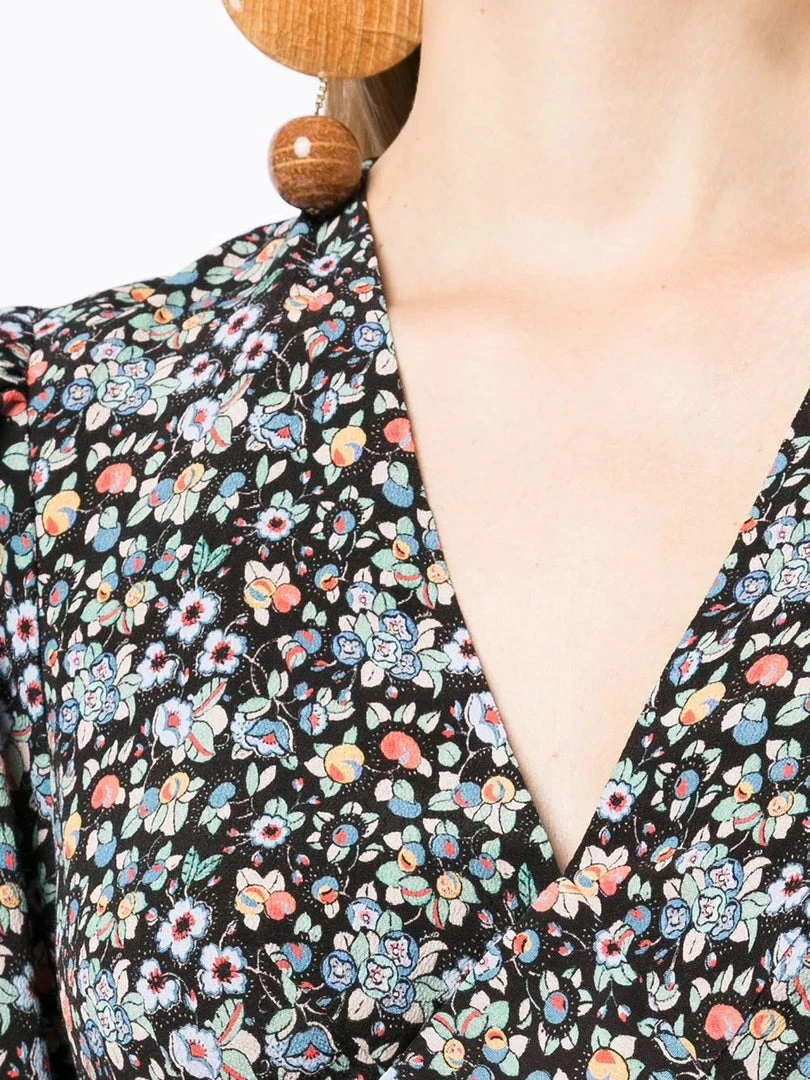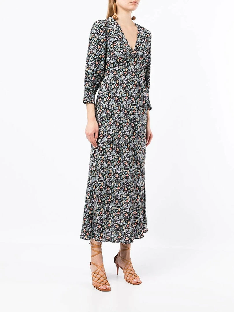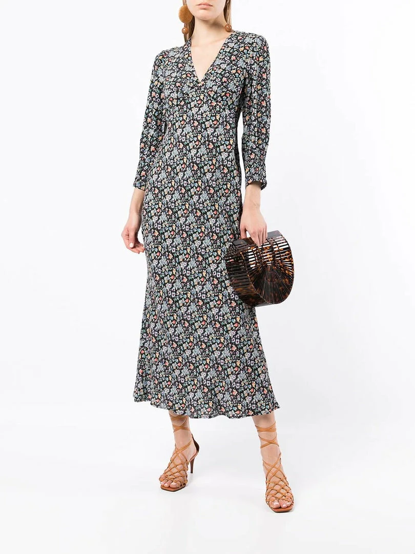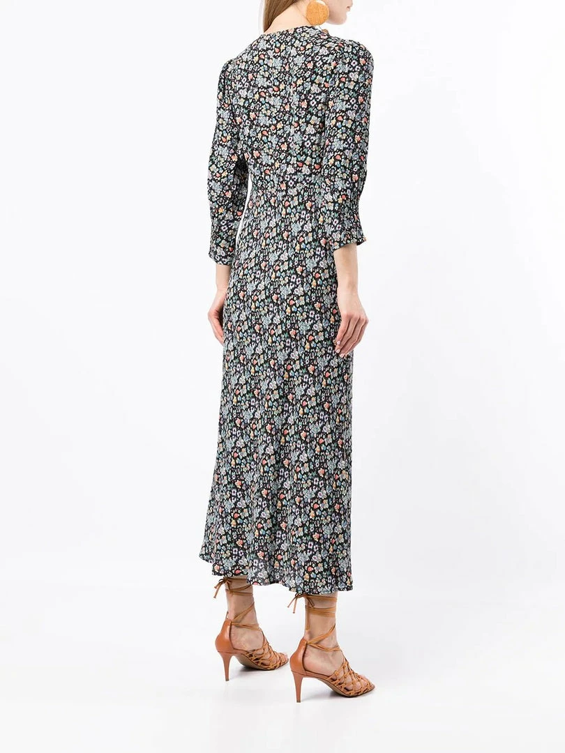 Rixo black ‘Callie’ floral midi dress featuring a V-neckline, half sleeves with elasticated cuffs, an empire waistline, a side zip fastening, a multicoloured floral motif print and a midi length. Item fits true to size. Model is wearing a size XS.Â