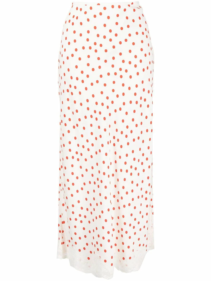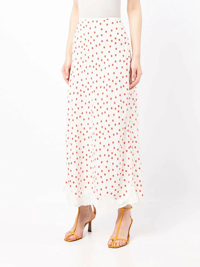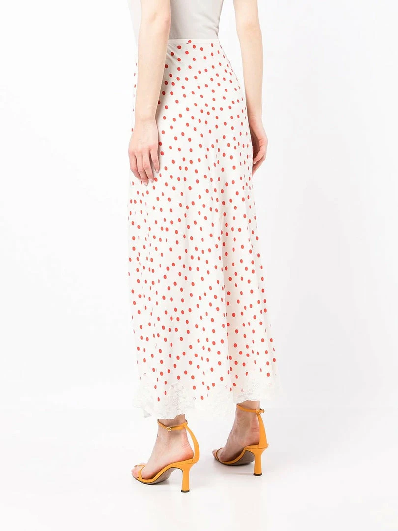 Rixo white ‘Crystal’ polka dot slip skirt featuring a side zip, hook and eye fastening, a scalloped lace hemline, a red polka dot print and a long length. Item fits true to size. Model is wearing a size XS.Â