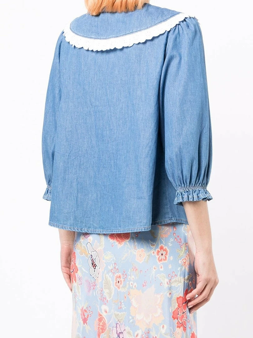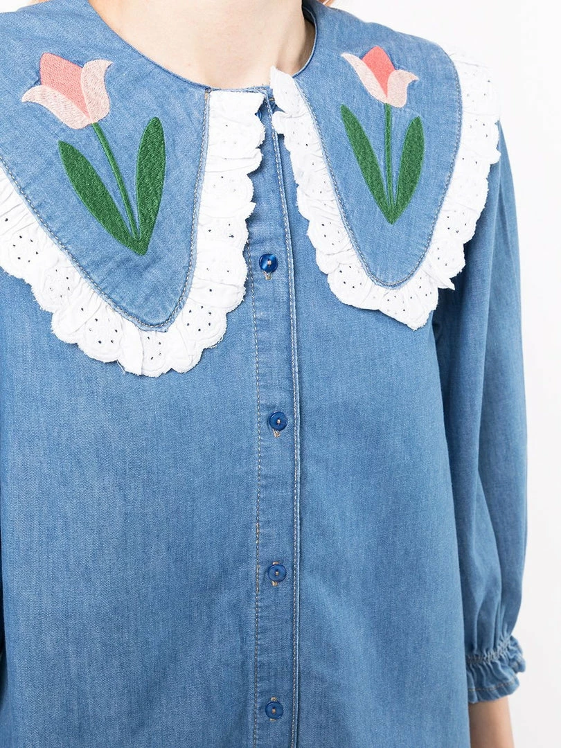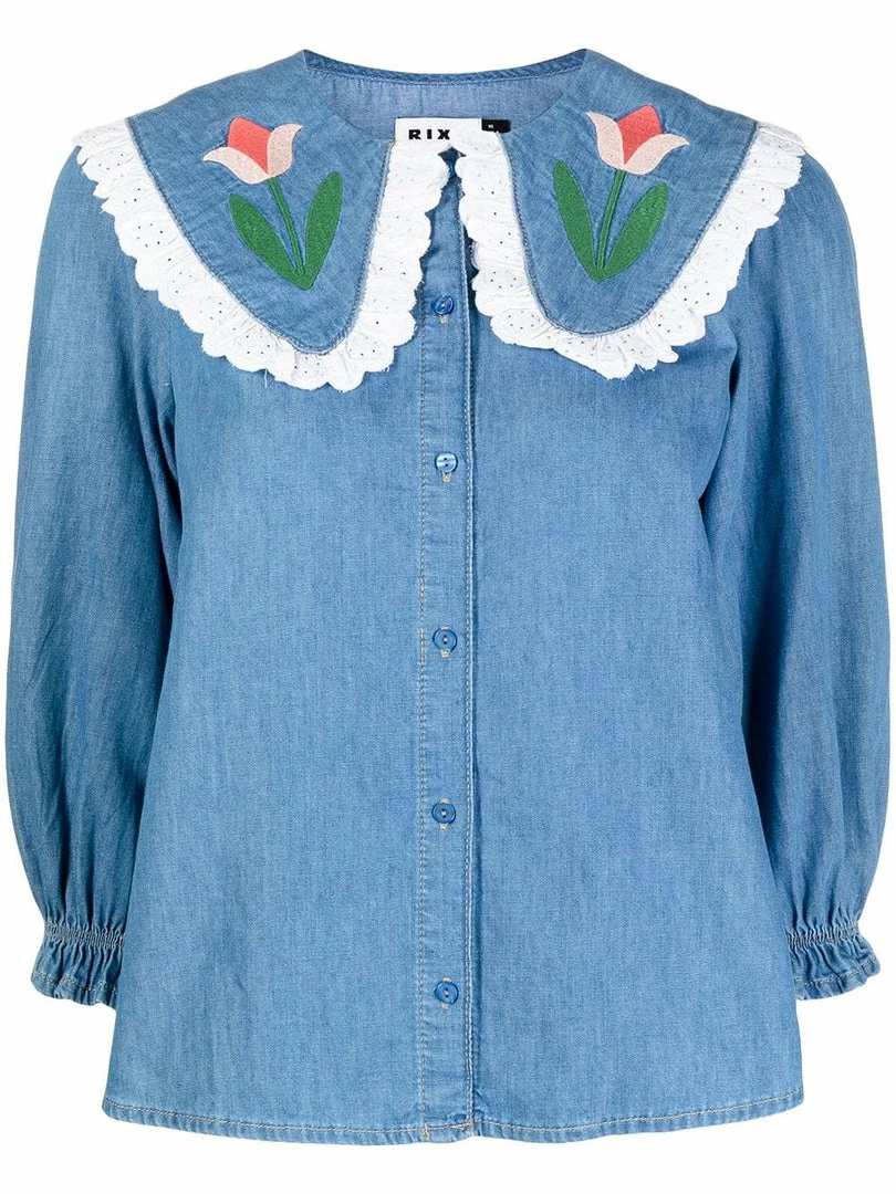 Rixo ‘Davina’ tulip embroidered shirt featuring an oversized collar with eyelet scalloped trimming and pink tulip embroidered details, three-quarter length sleeves with elasticated cuffs, front button fastenings and a medium blue denim wash. Item fits true to size. Model is wearing a size XS.Â