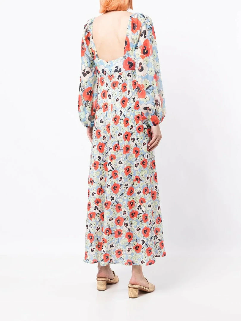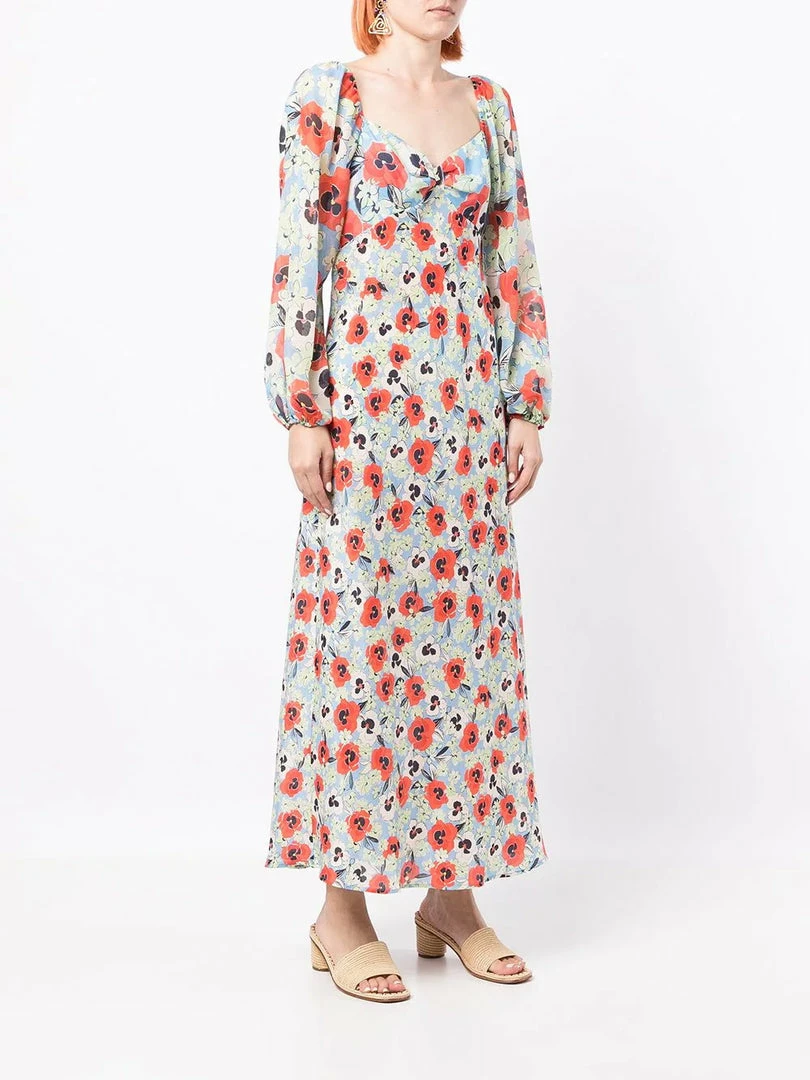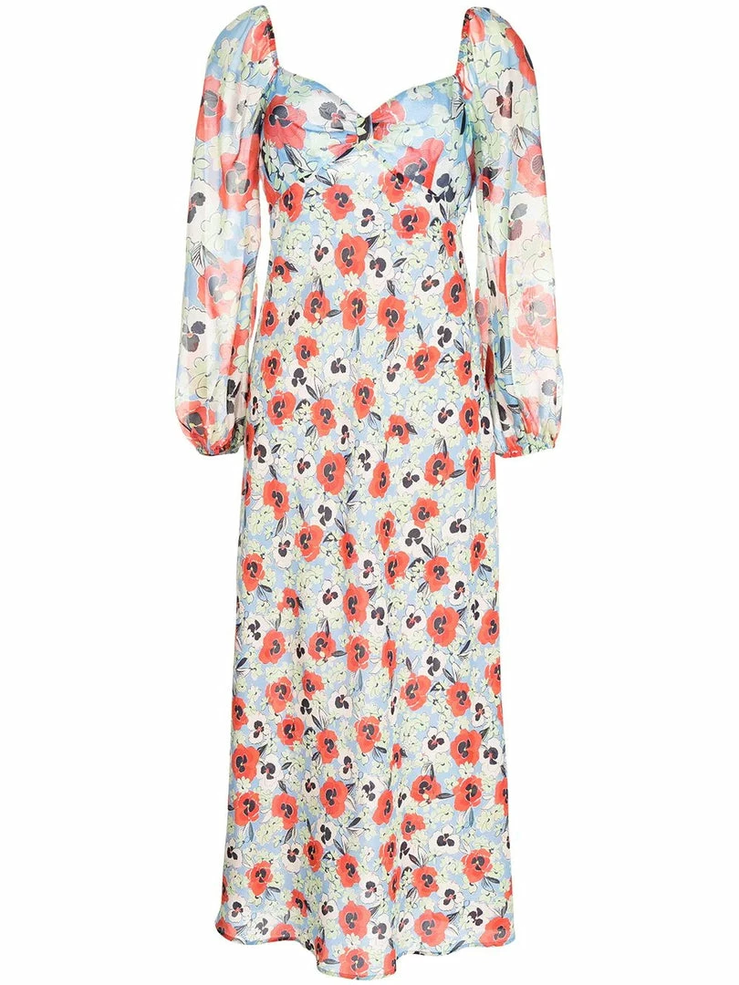 Rixo sheer baby blue ‘Gio’ pansy floral midi dress featuring a sweetheart neckline, elasticated shoulders, long puff sleeves with elasticated cuffs, a side zip fastening, an empire waistline, a multicoloured pansy floral print and a midi length. Item fits true to size. Model is wearing a size XS.Â