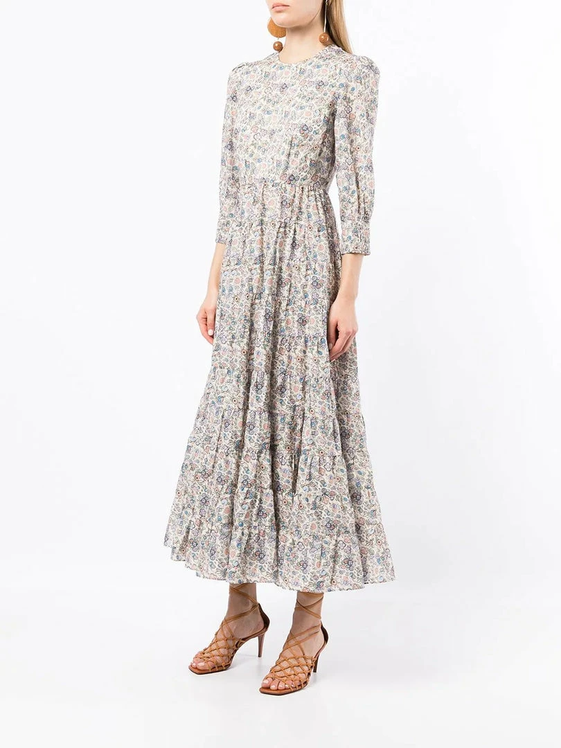 Rixo cream ‘Kristen’ pastel floral midaxi dress featuring a round neckline with a back button closure, half sleeves with elasticated cuffs, a side zip fastening, a tiered skirt, a multicoloured pastel floral motif print and a long midi length. Item fits true to size. Model is wearing a size XS.