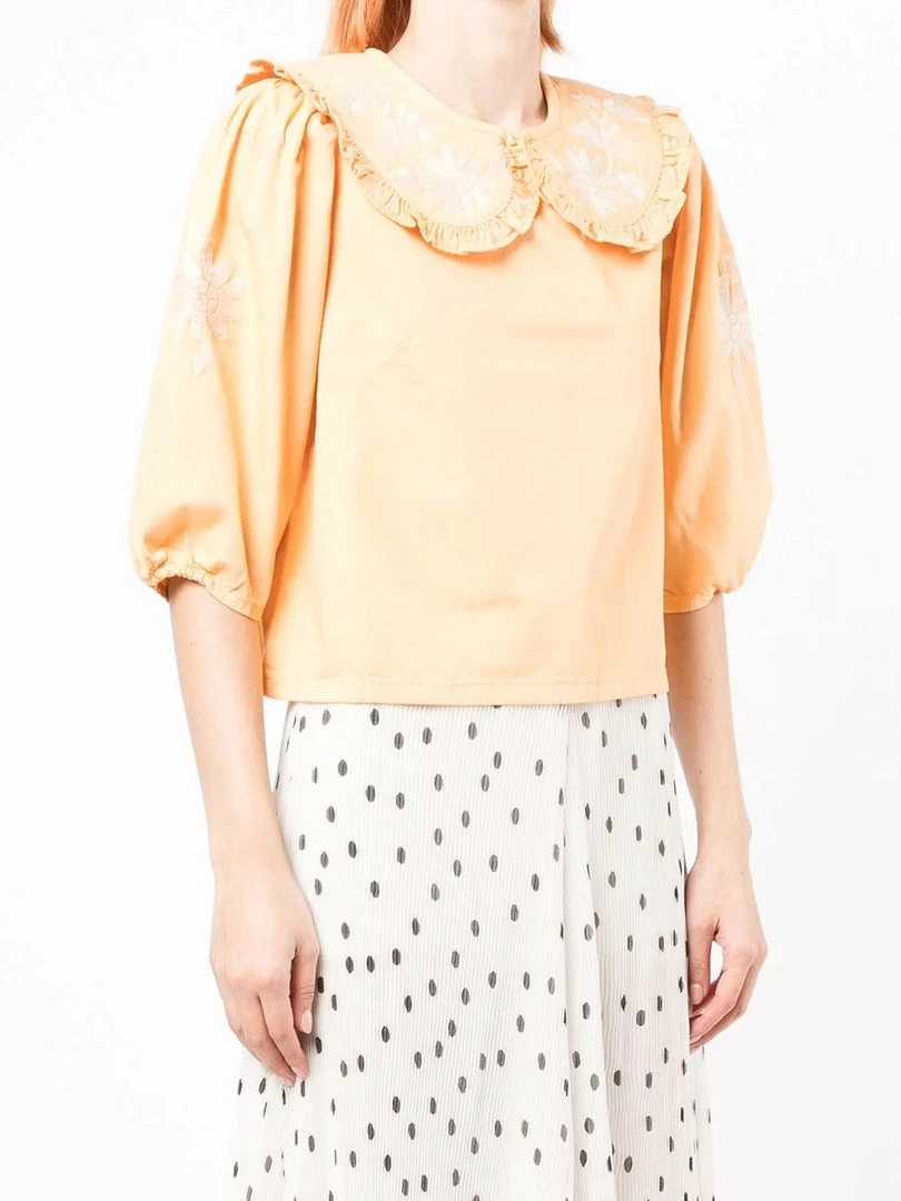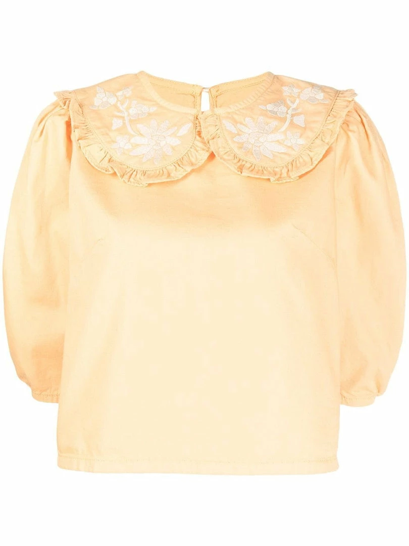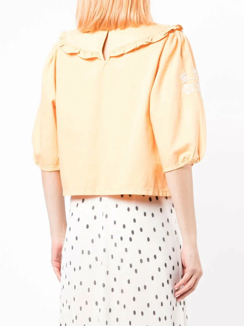 Rixo light peach ‘Lianna’ embroidered denim blouse featuring an oversized ruffle collar, a back button fastening, three-quarter length sleeves, white floral embroidered details and a straight hemline. Item fits true to size. Model is wearing a size XS.Â