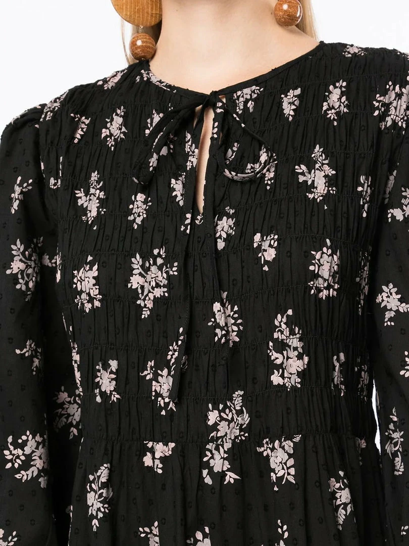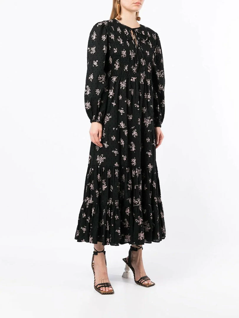 Rixo black ‘Lori’ floral bunch midi dress featuring a round neckline, a front tie detail, long sleeves with elasticated cuffs, a shirred top, a tiered skirt, a pink floral bunch print, black embroidered polka dot detailing, a midi length and pulls on. Item fits true to size. Model is wearing a size XS.Â
