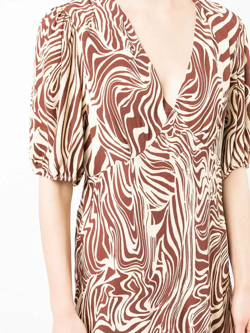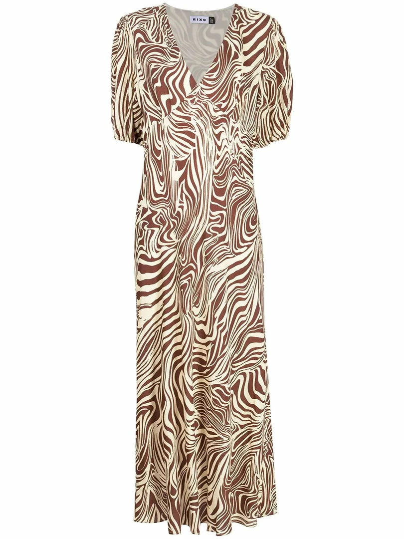 Rixo ‘Poppy’ marble zebra print midi dress featuring a V-neckline, short sleeves with elasticated cuffs, an empire waistline, a side zip fastening, a brown and beige marble effect zebra print and a midi length. Item fits true to size. Model is wearing a size S.