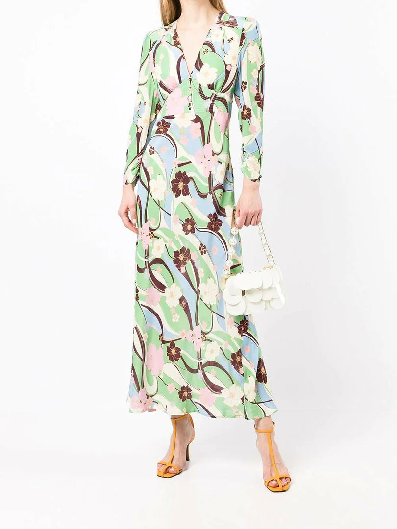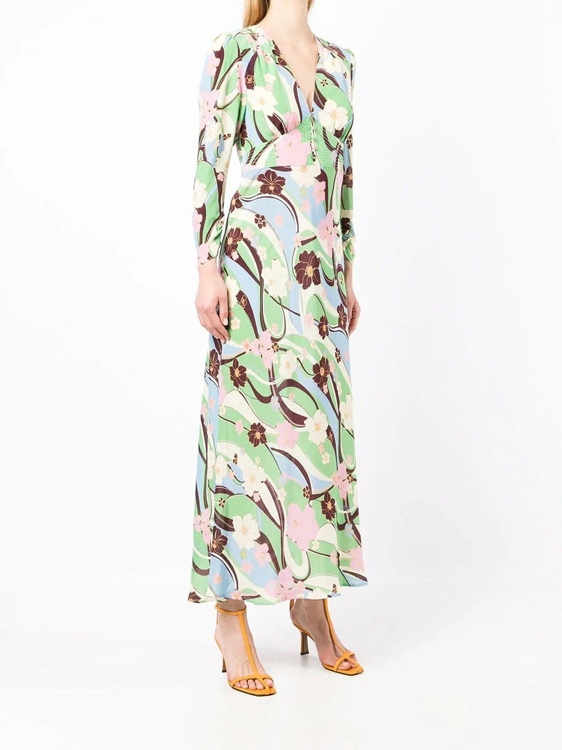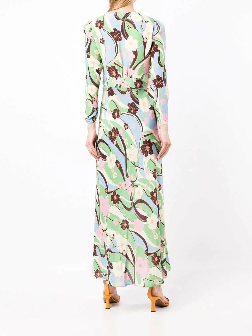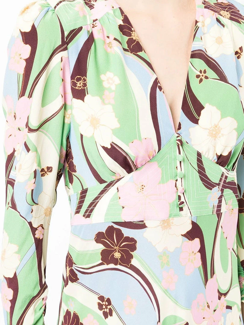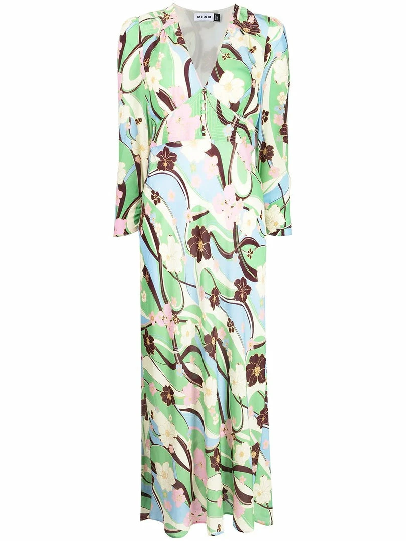 Rixo ‘Selma’ floral wave print midi dress featuring a V-neckline, long sleeves, front button details, a side zip fastening, a multicoloured retro wave and floral print and a midi length. Item fits true to size. Model is wearing a size XS.