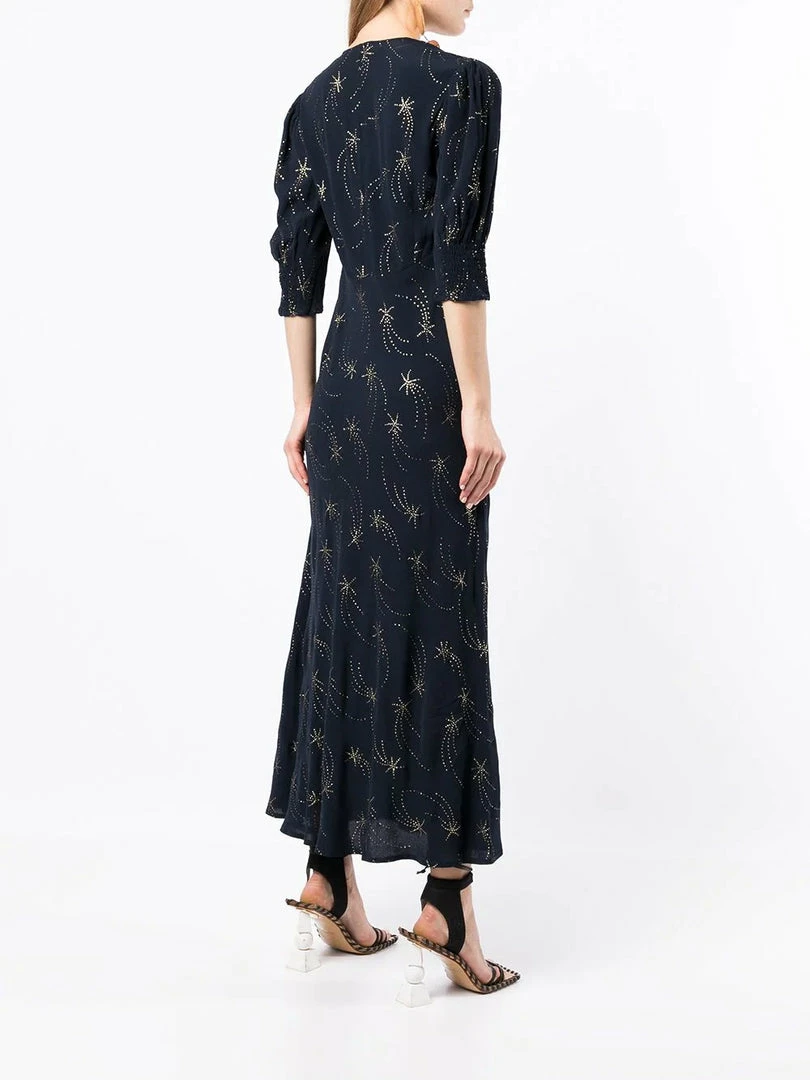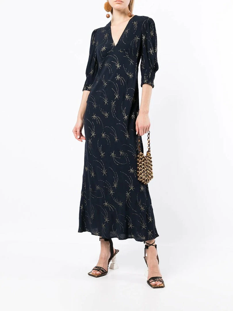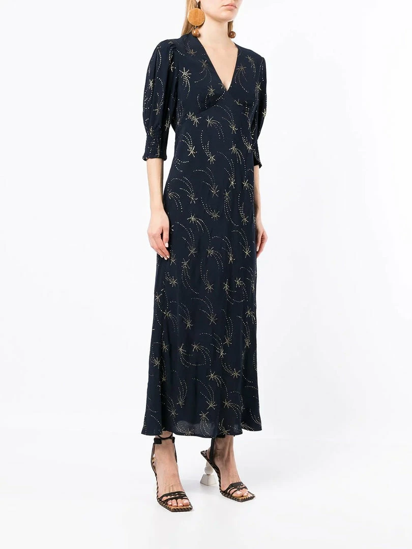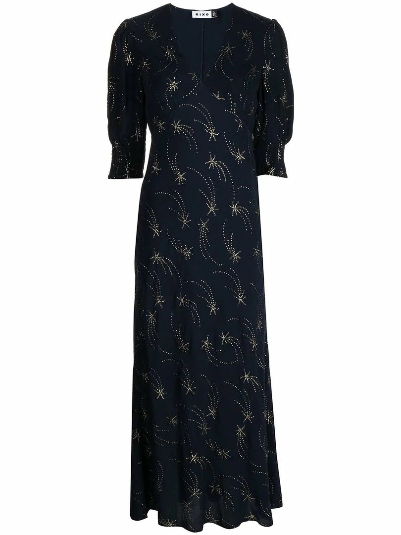 Rixo navy ‘Zadie’ glitter star midi dress featuring a V-neckline, short sleeves with elasticated cuffs, a side zip fastening, an empire waistline, a gold glitter shooting star print and a midi length. Item fits true to size. Model is wearing a size XS.Â