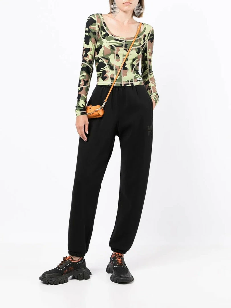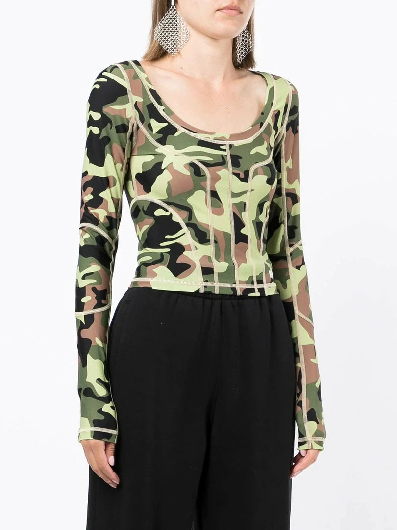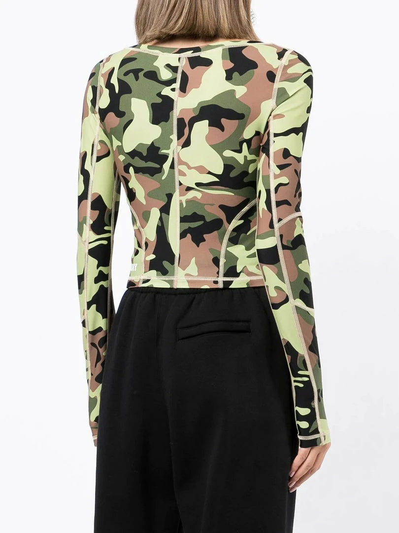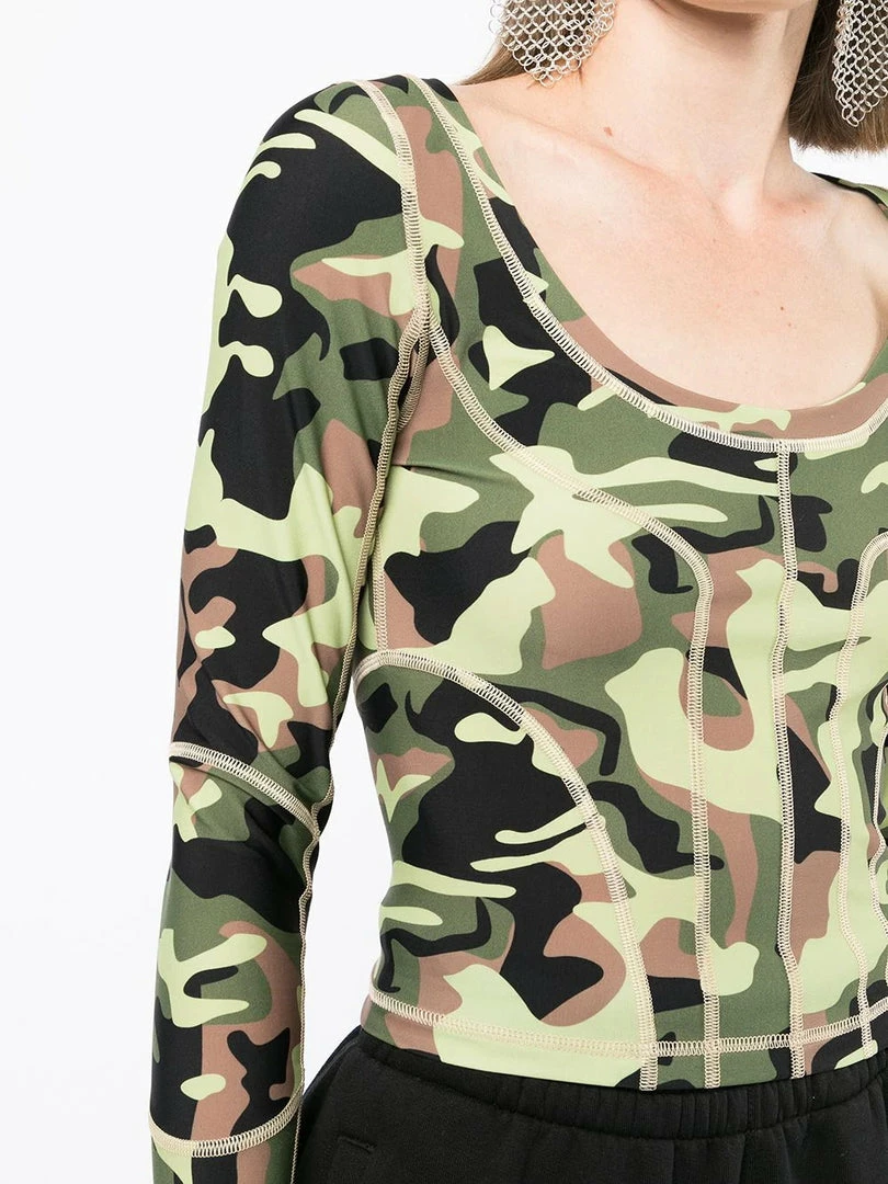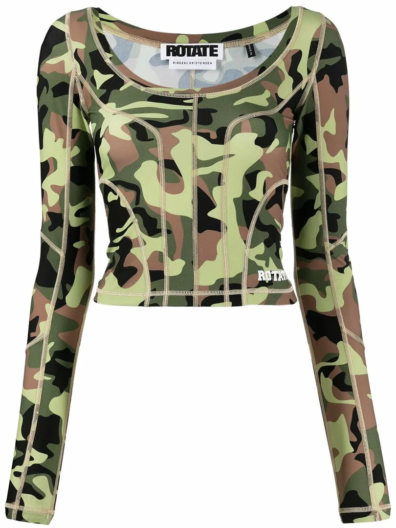Rotate Sunday ‘Tamisha’ camo top featuring a low round neckline, long sleeves, a white brand logo detail on the side, a green camouflage print, beige stitching details and pulls on. Item fits true to size. Model is wearing a size S.Â