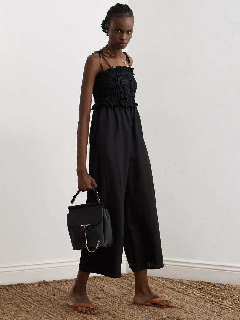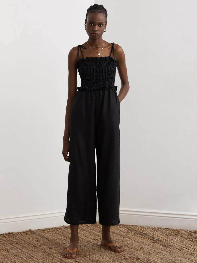Sancia black ‘Aerin’ jumpsuit featuring adjustable tie straps, a shirred top with ruffle trimming, side slip pockets, a wide leg fit and pulls on. Item fits true to size. Model is wearing a size XS.