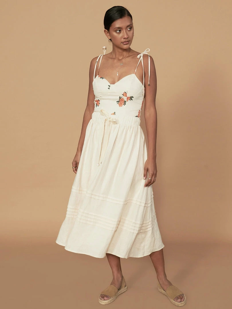 Sancia nude pearl toned ‘Meera’ linen midi skirt featuring an elasticated drawstring waistband, side slip pockets, horizontal pleated details, a midi length and pulls on. Item fits true to size. Model is wearing a size XS.