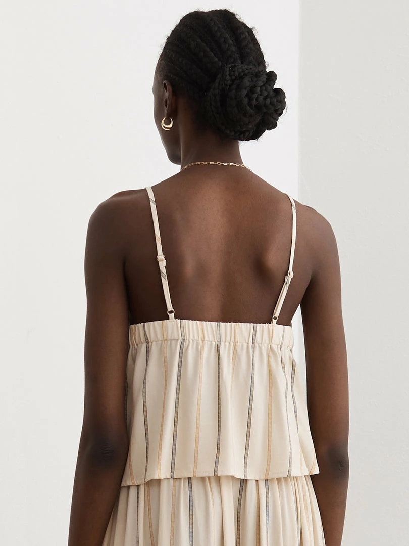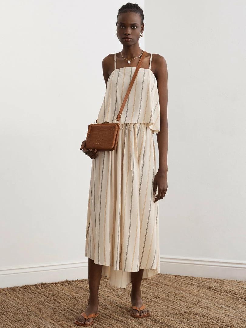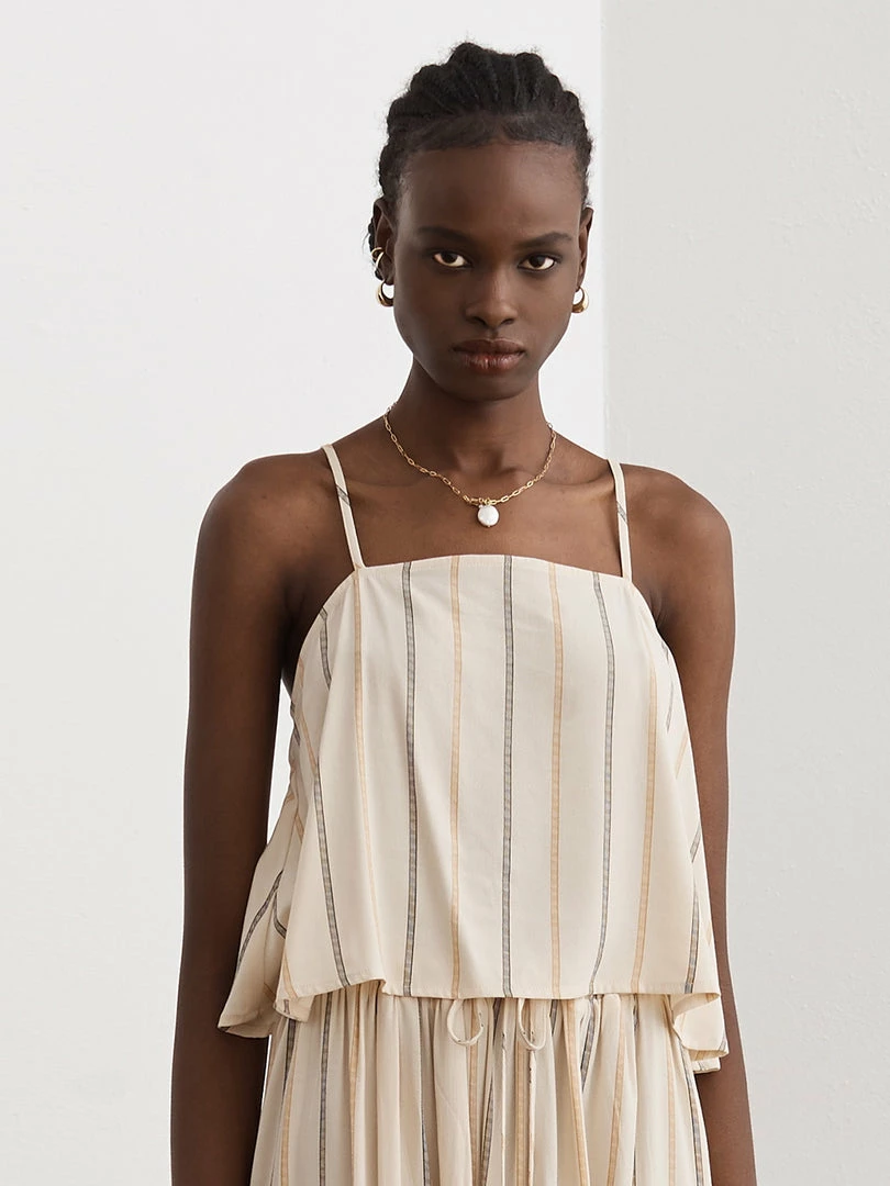 Sancia light beige ‘Jimena’ stripe crop top featuring adjustable spaghetti straps, a straight neckline, an elasticated back band, a navy and orange vertical stripe print, a relaxed fit and pulls on. Item fits true to size. Model is wearing a size XS.