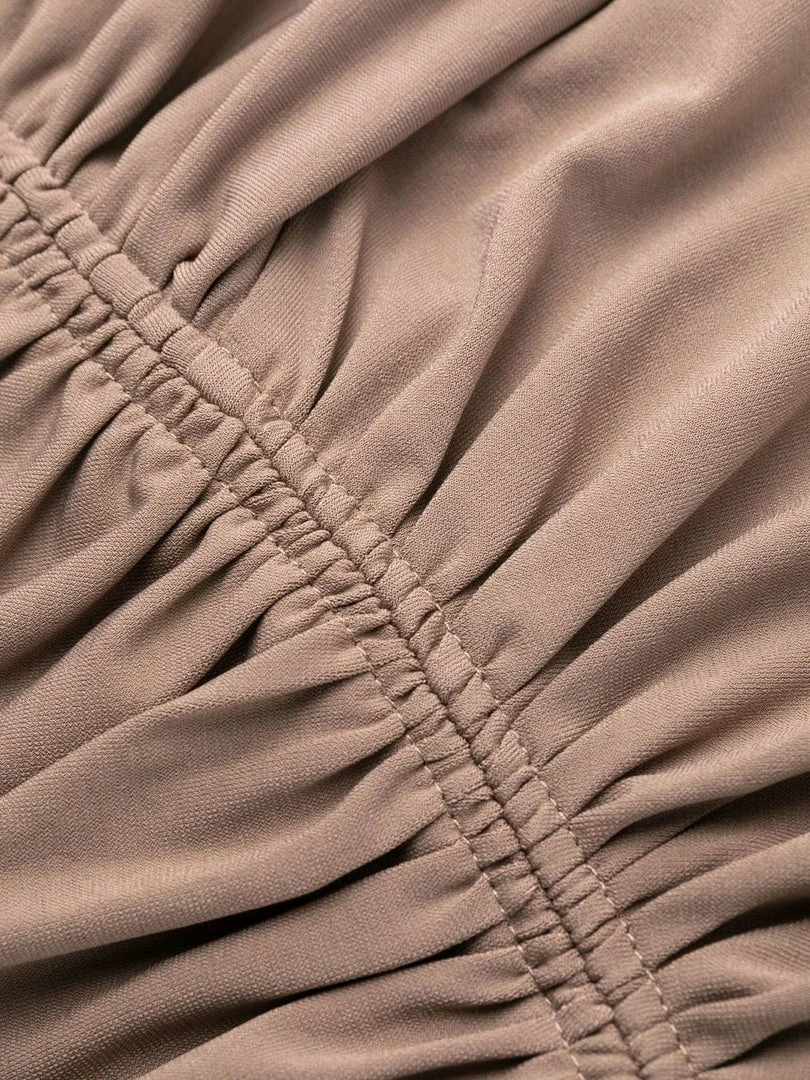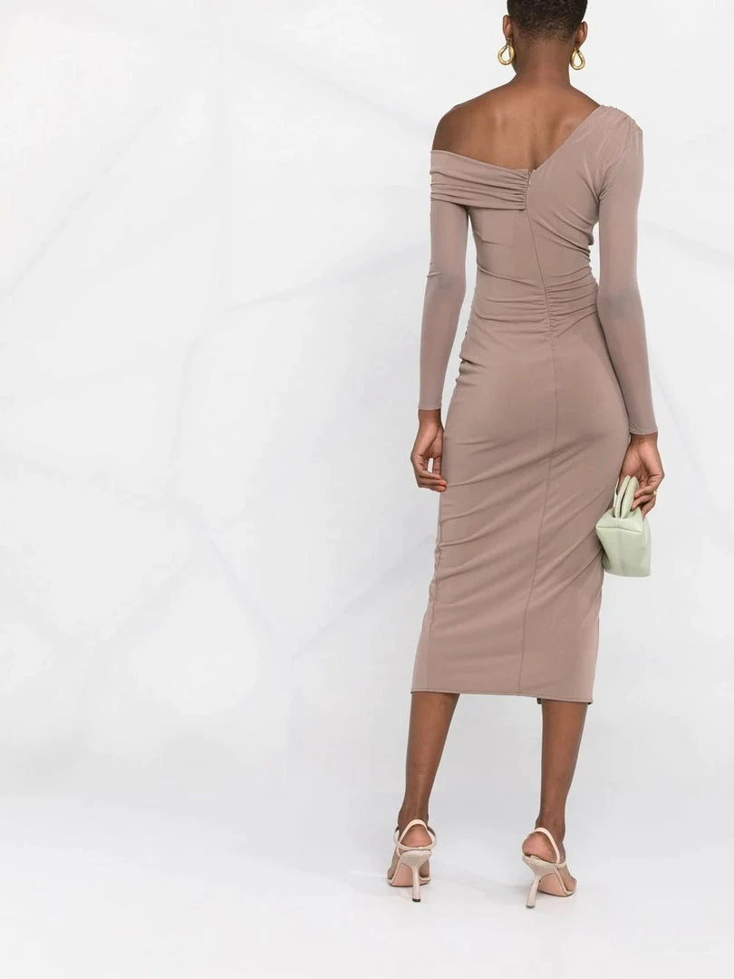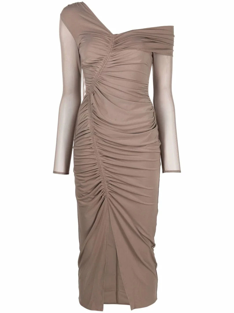 Self-Portrait taupe ‘Jersey One Shoulder Ruched Midi Dress’ featuring an off the shoulder design, long sheer sleeves, a back zip and hook fastening, ruched detailing and a front slit design. Item fits true to size. Model is wearing a size 8 UK.