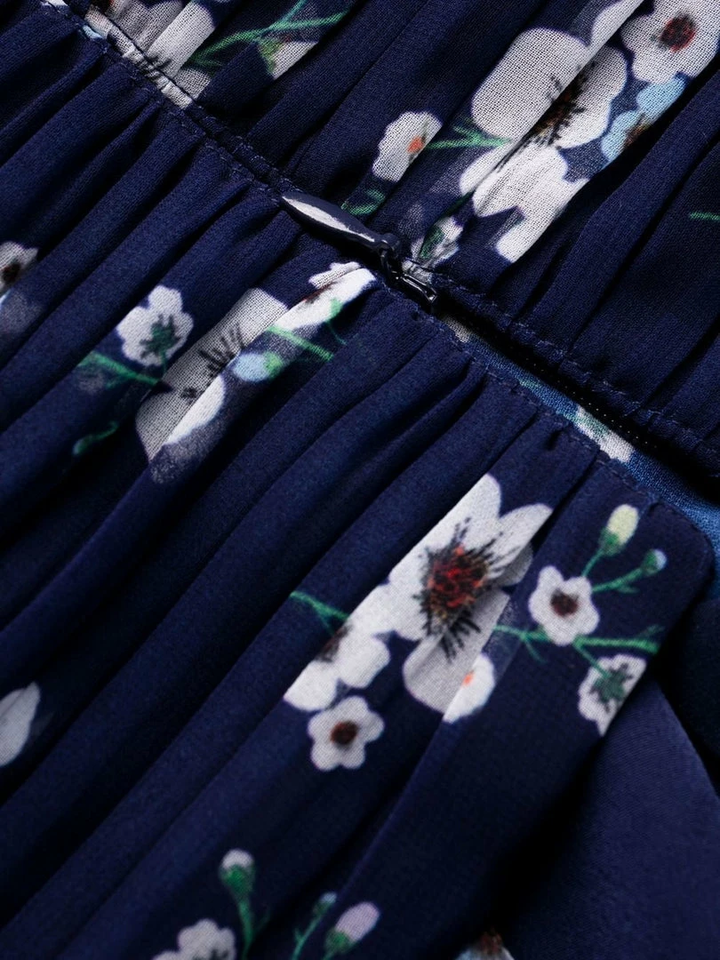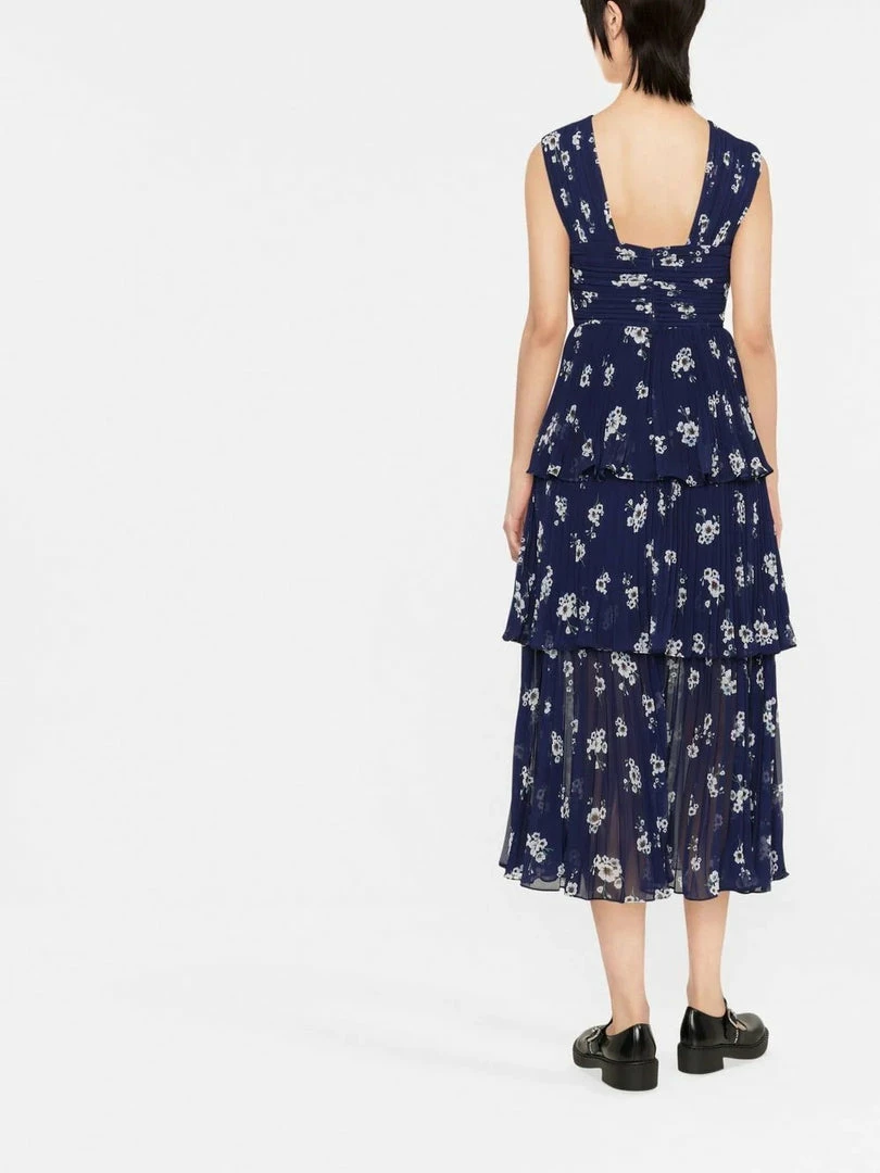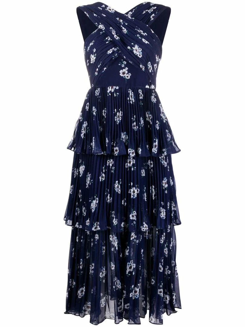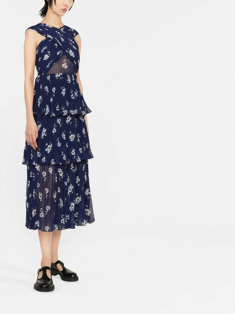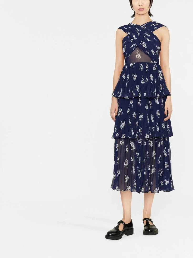 Self-Portrait blue ‘Pansy Print Chiffon Crossover Midi Dress’ featuring a back zip fastening, a sleeveless style, a pleated and tiered design and a floral print. Item fits true to size. Model is wearing a size 8 UK.
