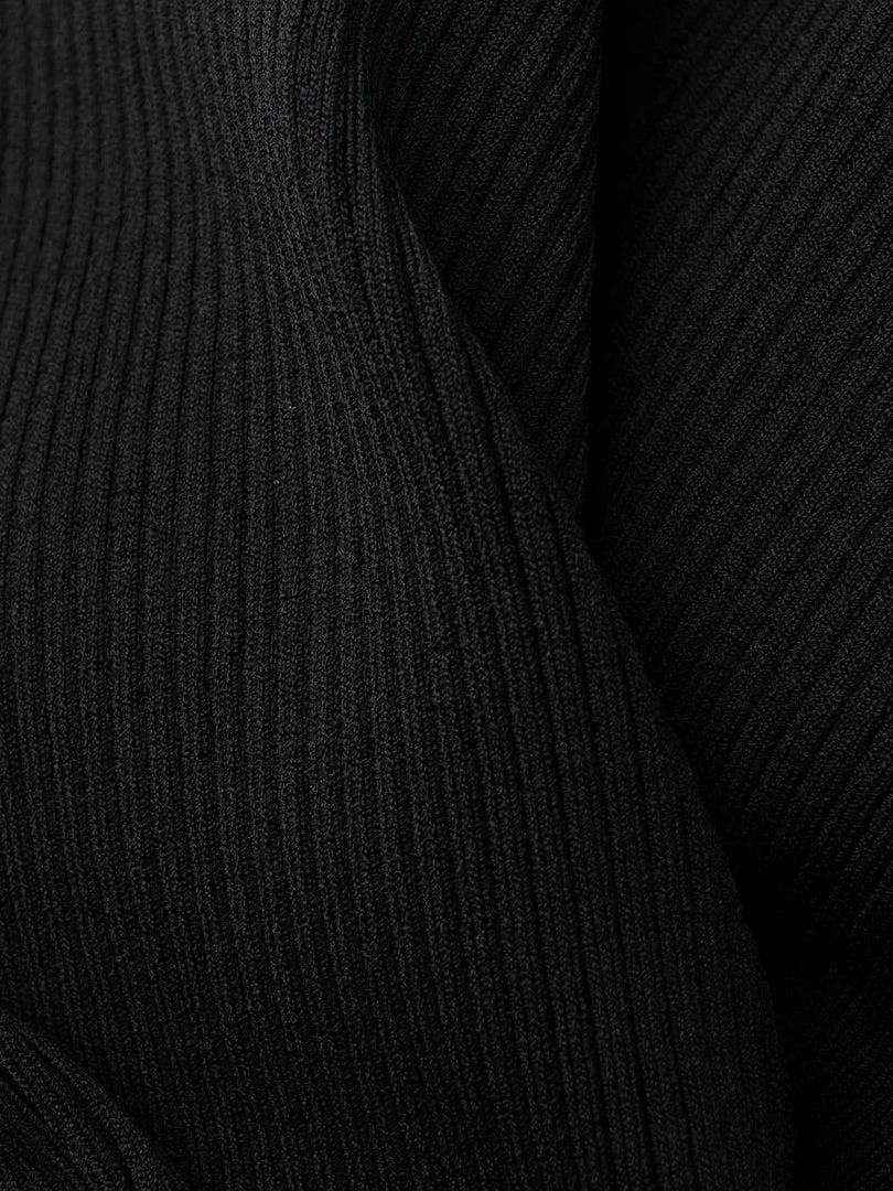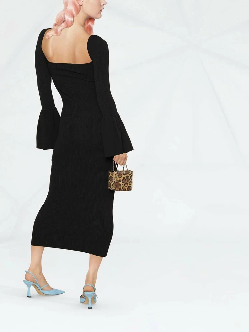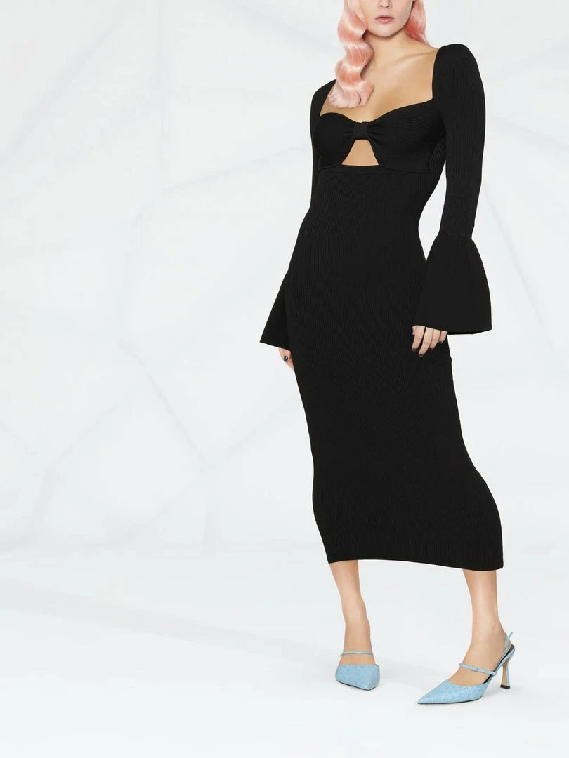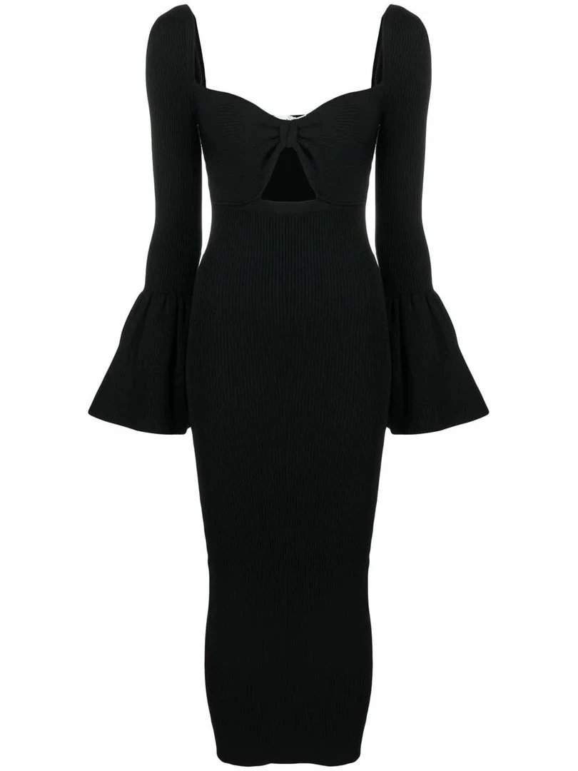 Self-Portrait black ‘Ribbed Knit Bow Bust Midi Dress’ featuring a front cut out design, long sleeves with flared cuffs, a pull on style and a fitted silhouette. Item fits true to size. Model is wearing a size S.