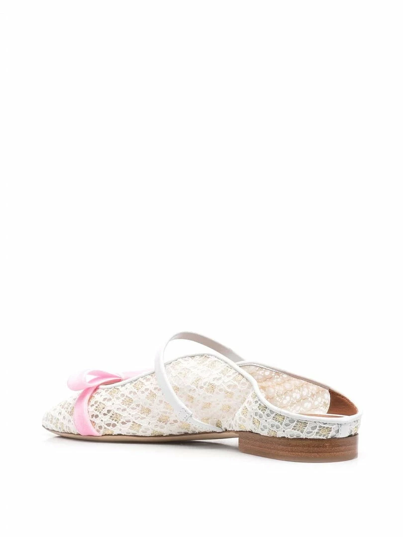 Malone Souliers x Bridgerton ‘Marguerite’ flat pumps featuring a pointed toe, a white and gold laced design, a pink bow detail, a single leather strap, a branded insole and a slip on style. Made in Italy. Item fits true to size. Italian Sizing.