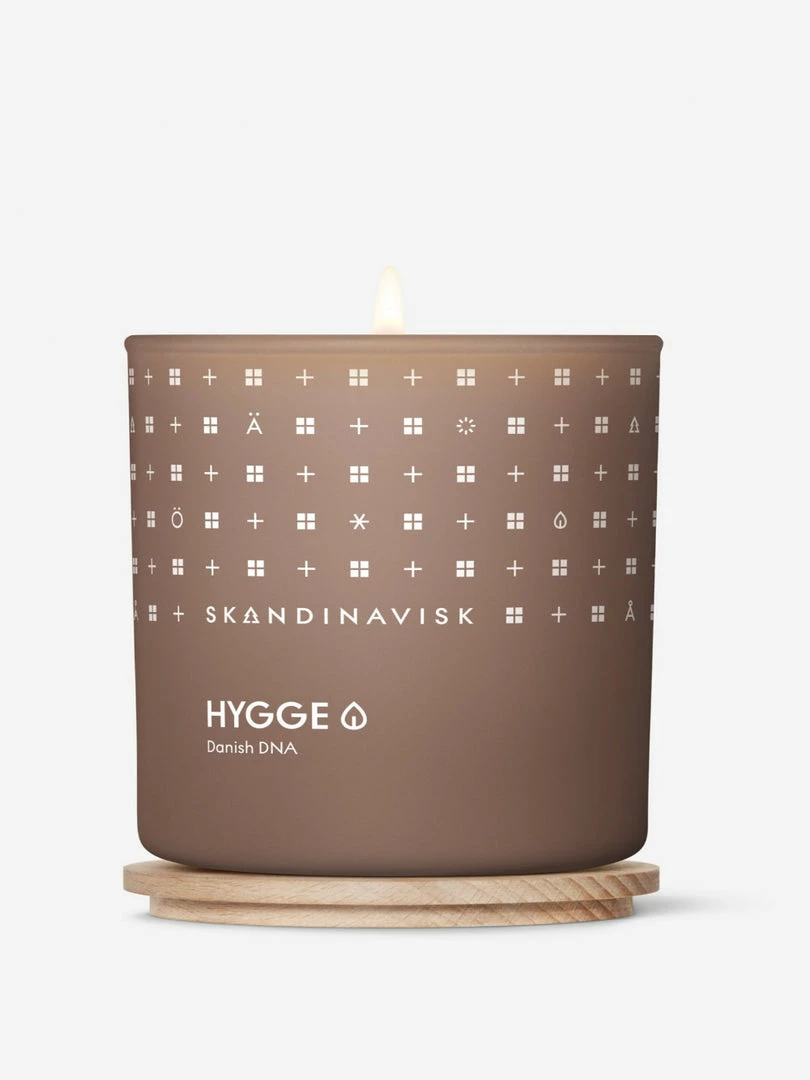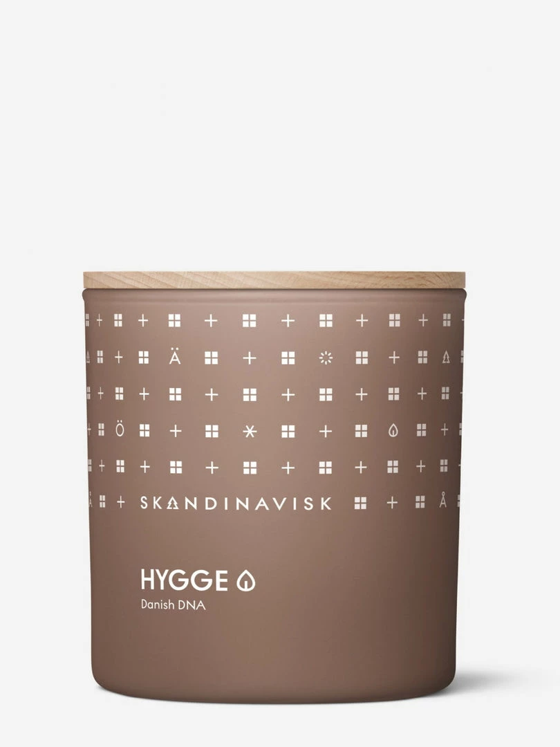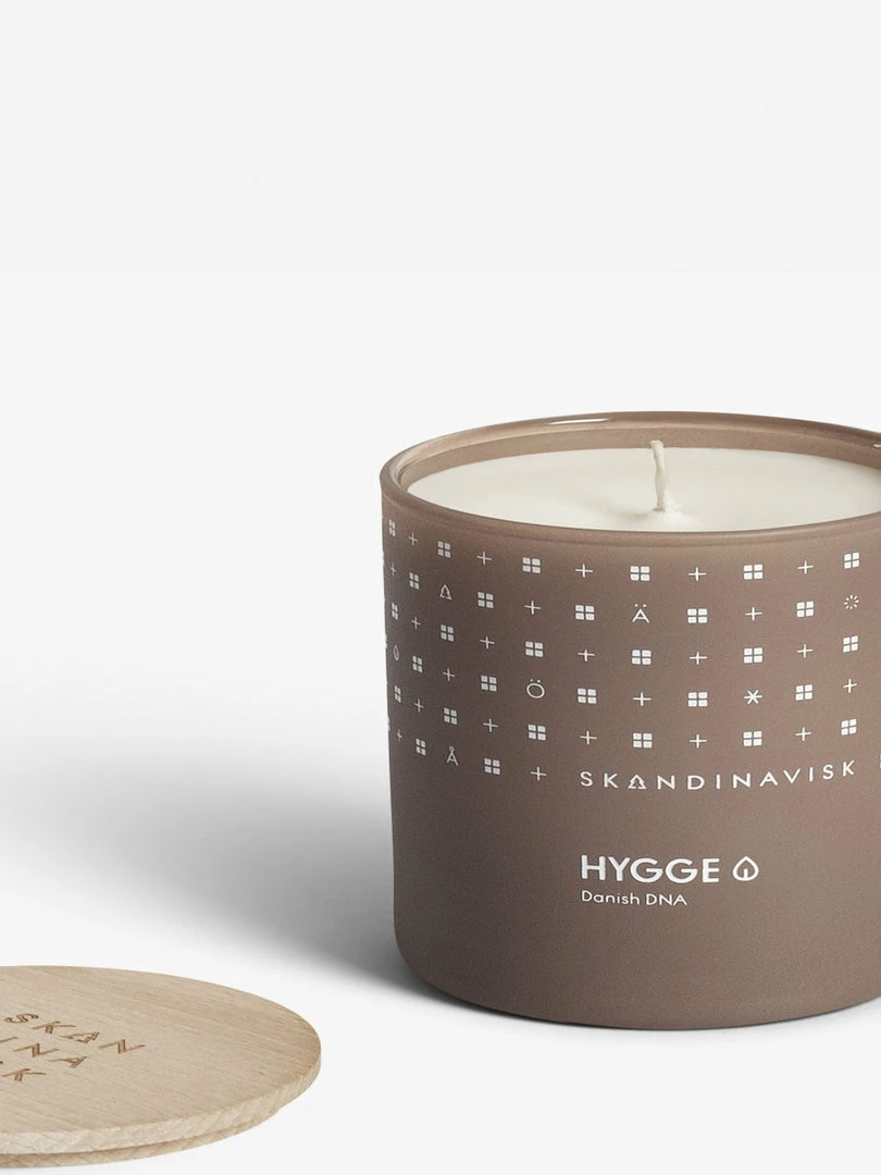 Skandinavisk ‘HYGGE’ scented candle featuring a perfume and Swedish rapeseed wax blend in painted glass with a pure cotton wick and engraved beechwood lid. 200ML.