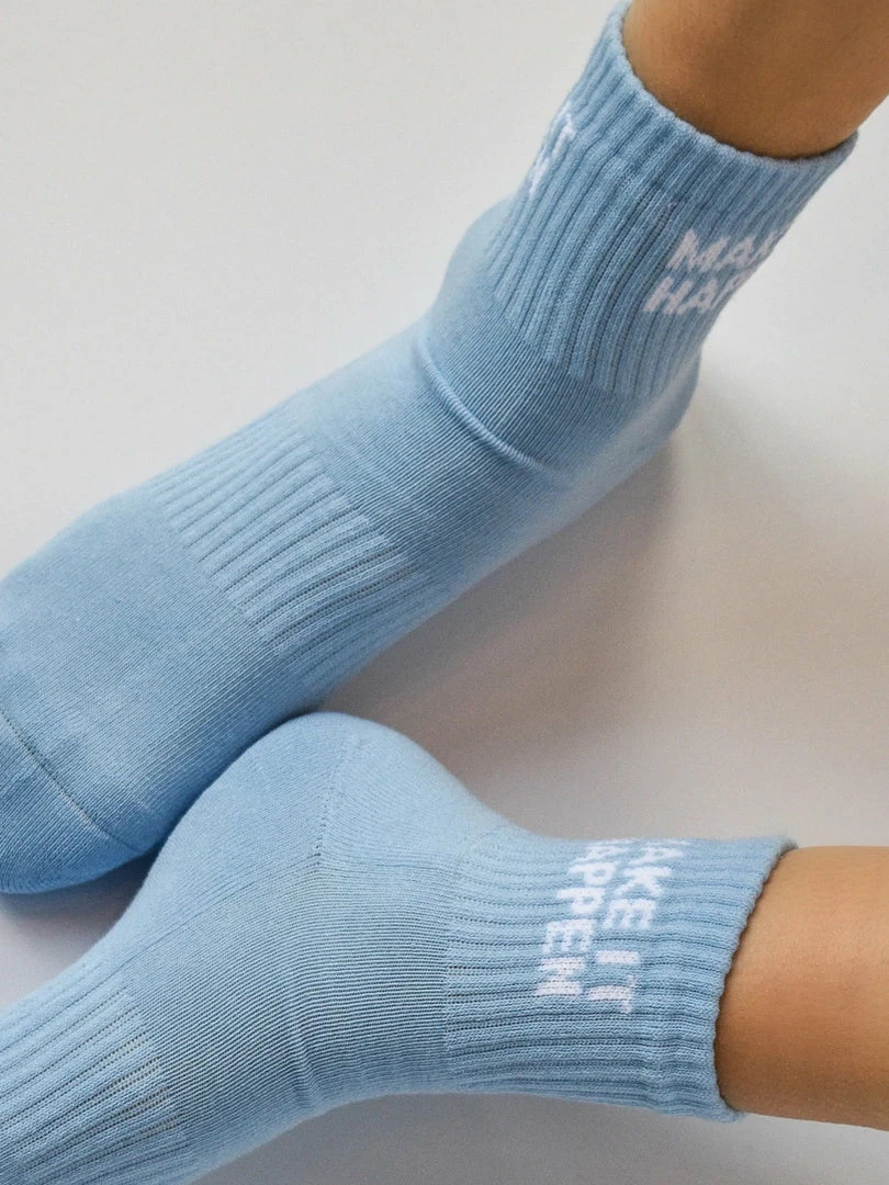 Soxygen sky blue ‘Make It Happen’ ankle socks featuring a cushioned heel and toe, arch support, a brand logo on the sole, a white ‘Make It Happen’ slogan on the sides and a ribbed design. Unisex style. Item is One Size.