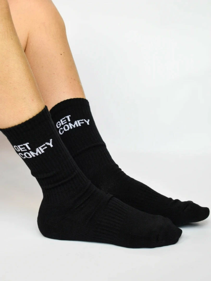Soxygen black ‘Get Comfy’ classic socks featuring a cushioned heel and toe, arch support, a brand logo on the sole, a white ‘Get Comfy’ slogan on the sides and a ribbed design. Unisex style. Item is One Size.