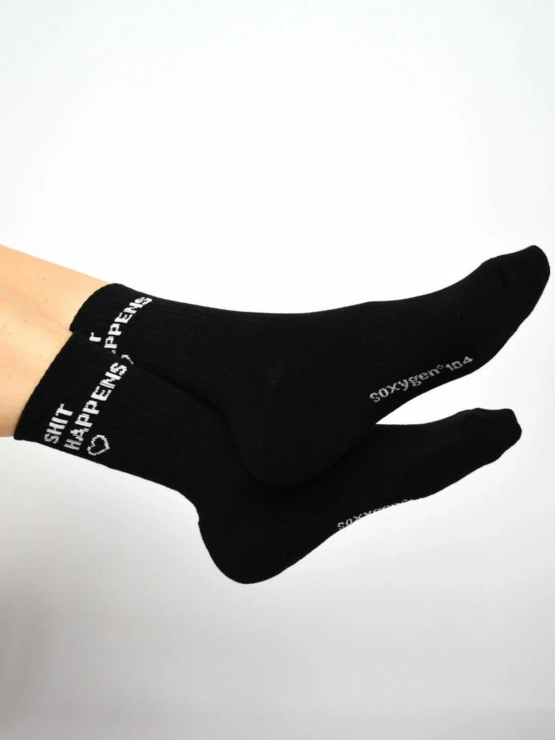 Soxygen black ‘Shit Happens’ classic socks featuring a cushioned heel and toe, arch support, a brand logo on the sole, a white ‘You Got This’ slogan and love heart on the sides and a ribbed design. Unisex style. Item is One Size.