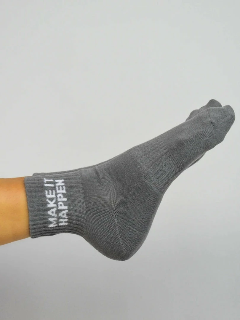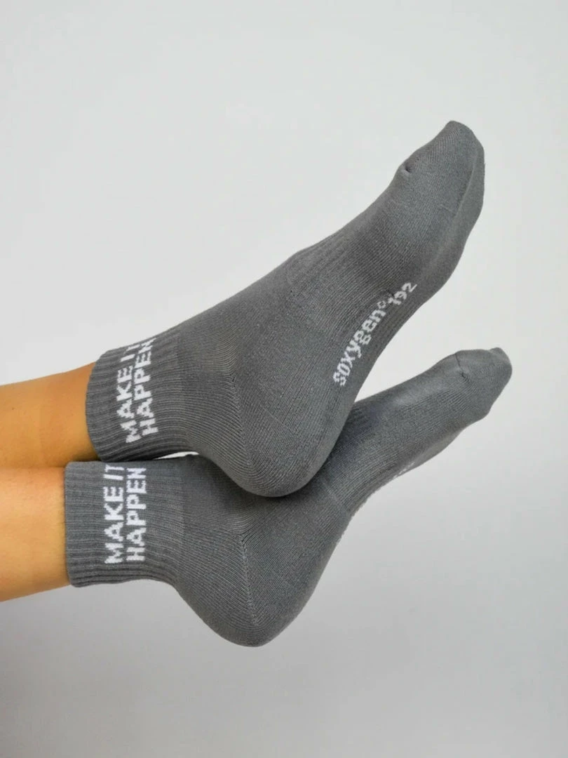 Soxygen grey ‘Make It Happen’ ankle socks featuring a cushioned heel and toe, arch support, a brand logo on the sole, a white ‘Make It Happen’ slogan on the sides and a ribbed design. Unisex style. Item is One Size.